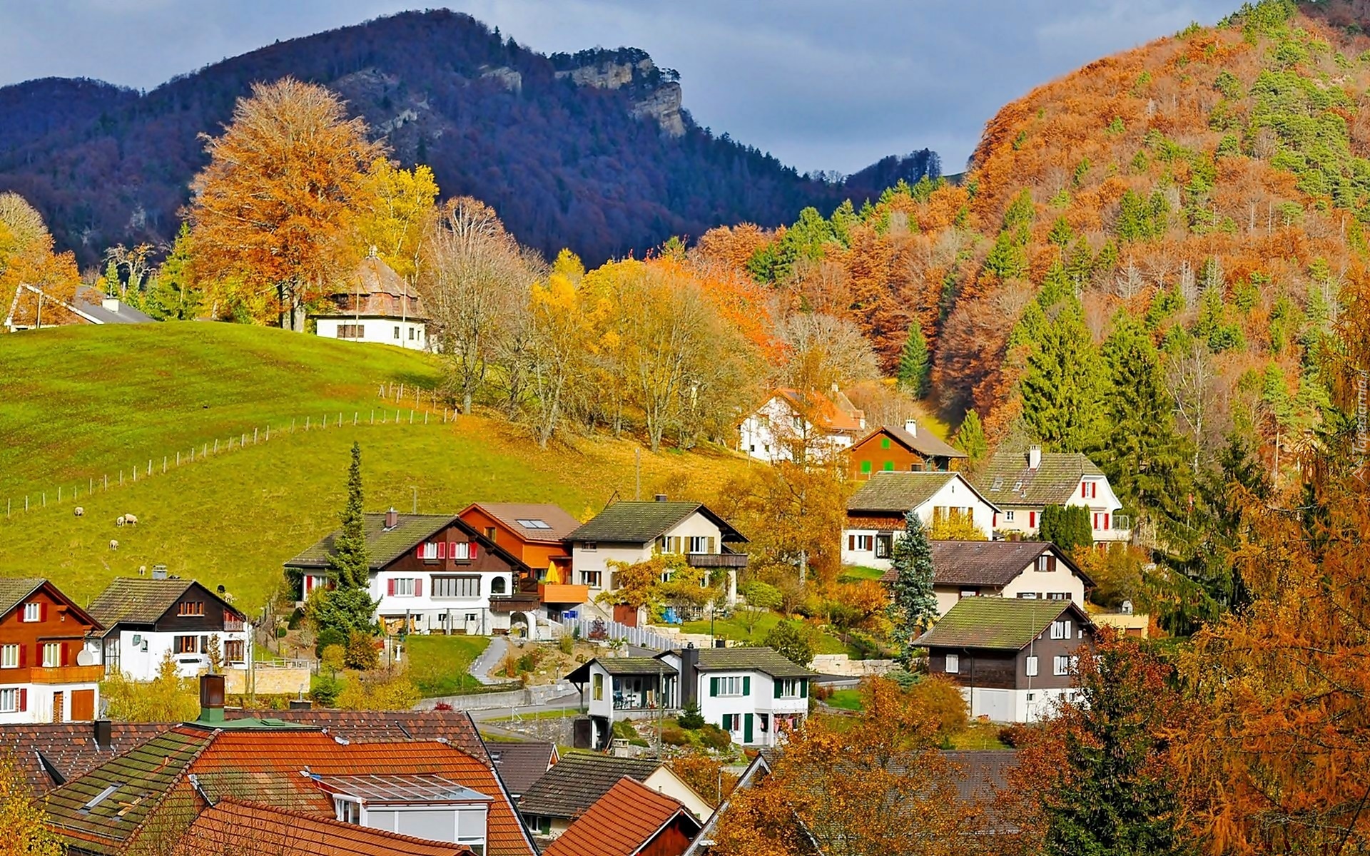 Edytor tapety: Jesień, Góry, Lasy, Łąki, Wioska, Alpejska