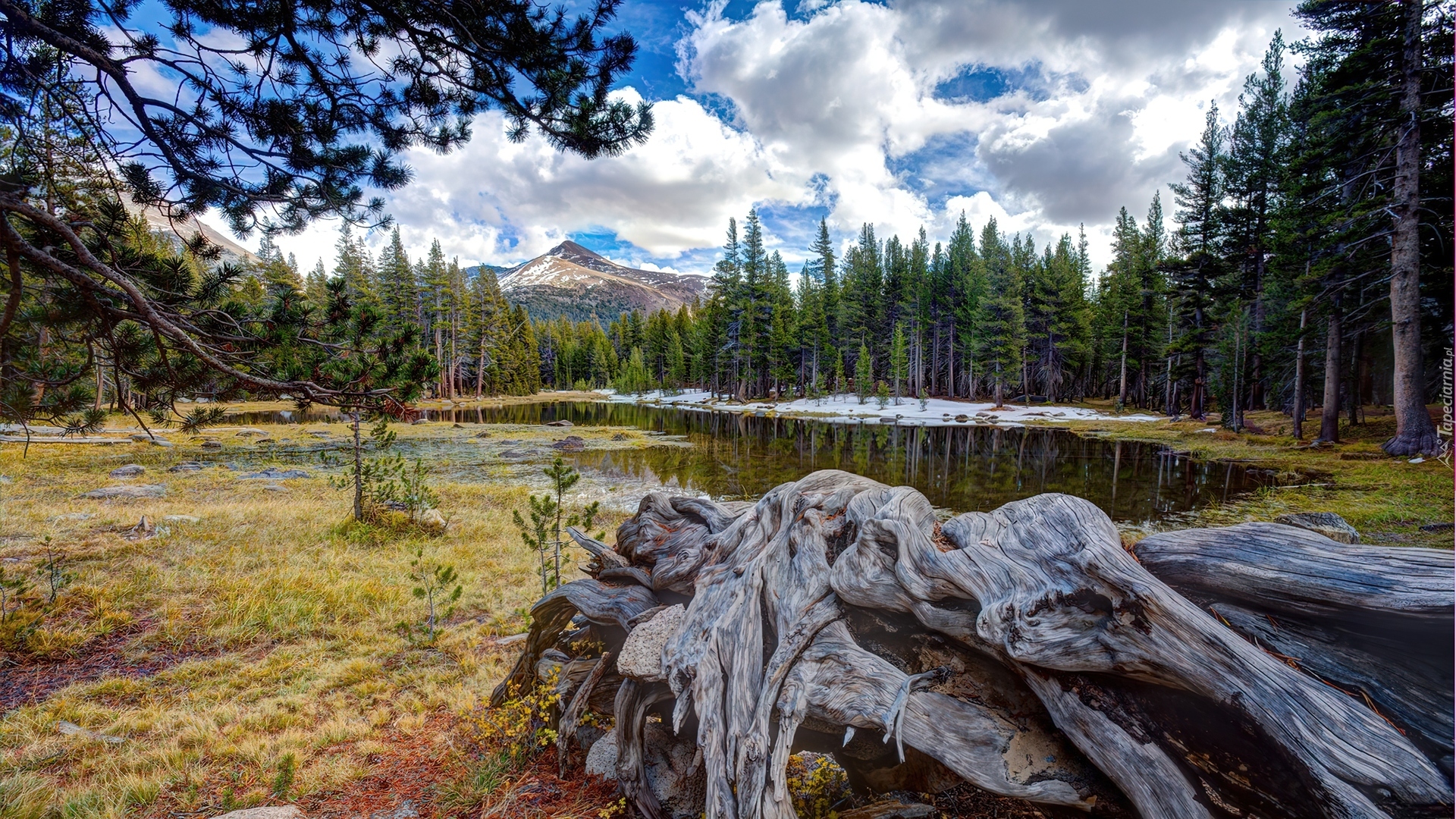 Edytor tapety: Las, Łąka, Góry, Staw, Pień, Drzewa