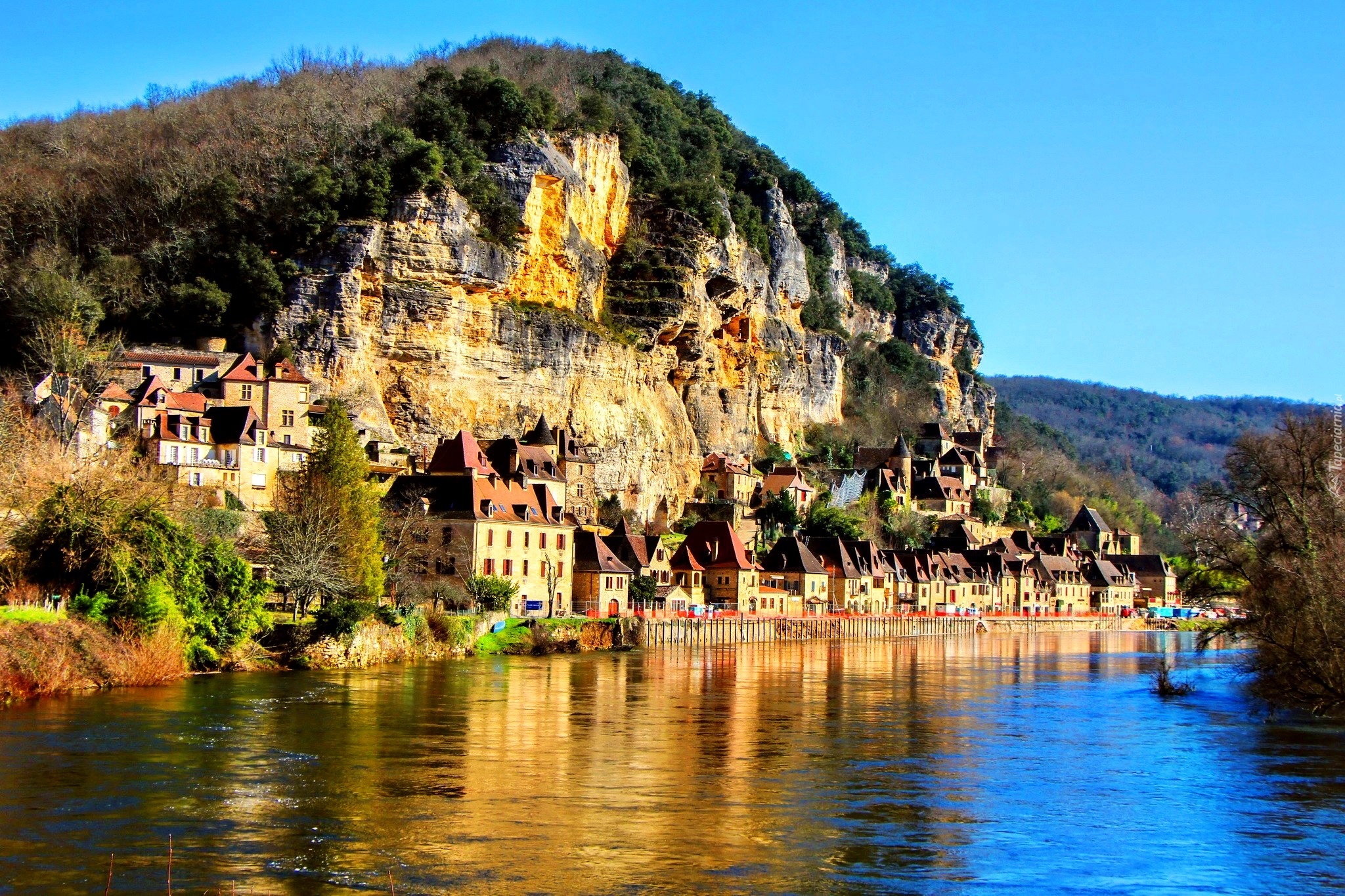 Edytor tapety: Rzeka, Skały, Domy, La Roque Gageac, Francja