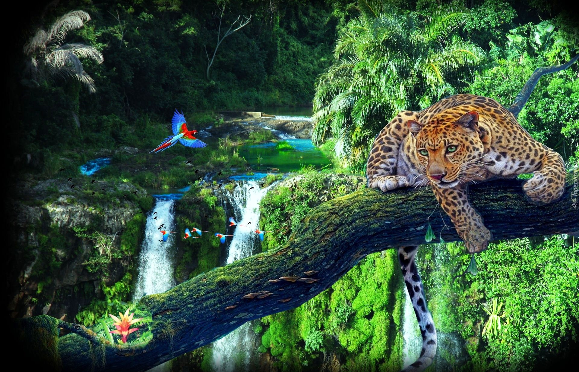 Edytor tapety: Lampart, Papuga, Wodospad, Drzewa