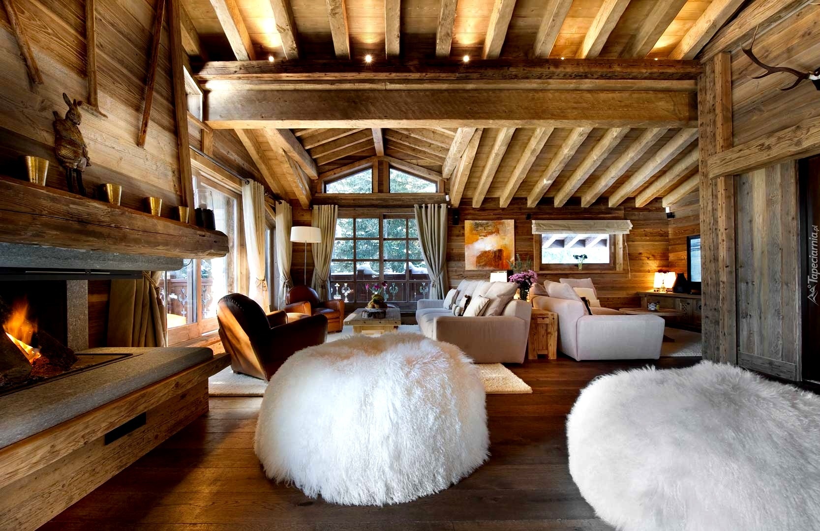 Edytor tapety: Dom, Wnętrze, Futrzane, Pufy, Kominek
