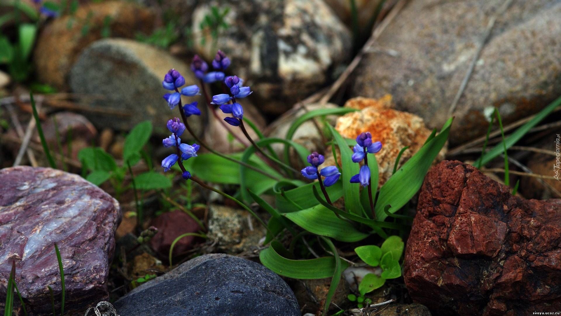Edytor tapety: Niebieskie, Pierwiosnki, Kamienie