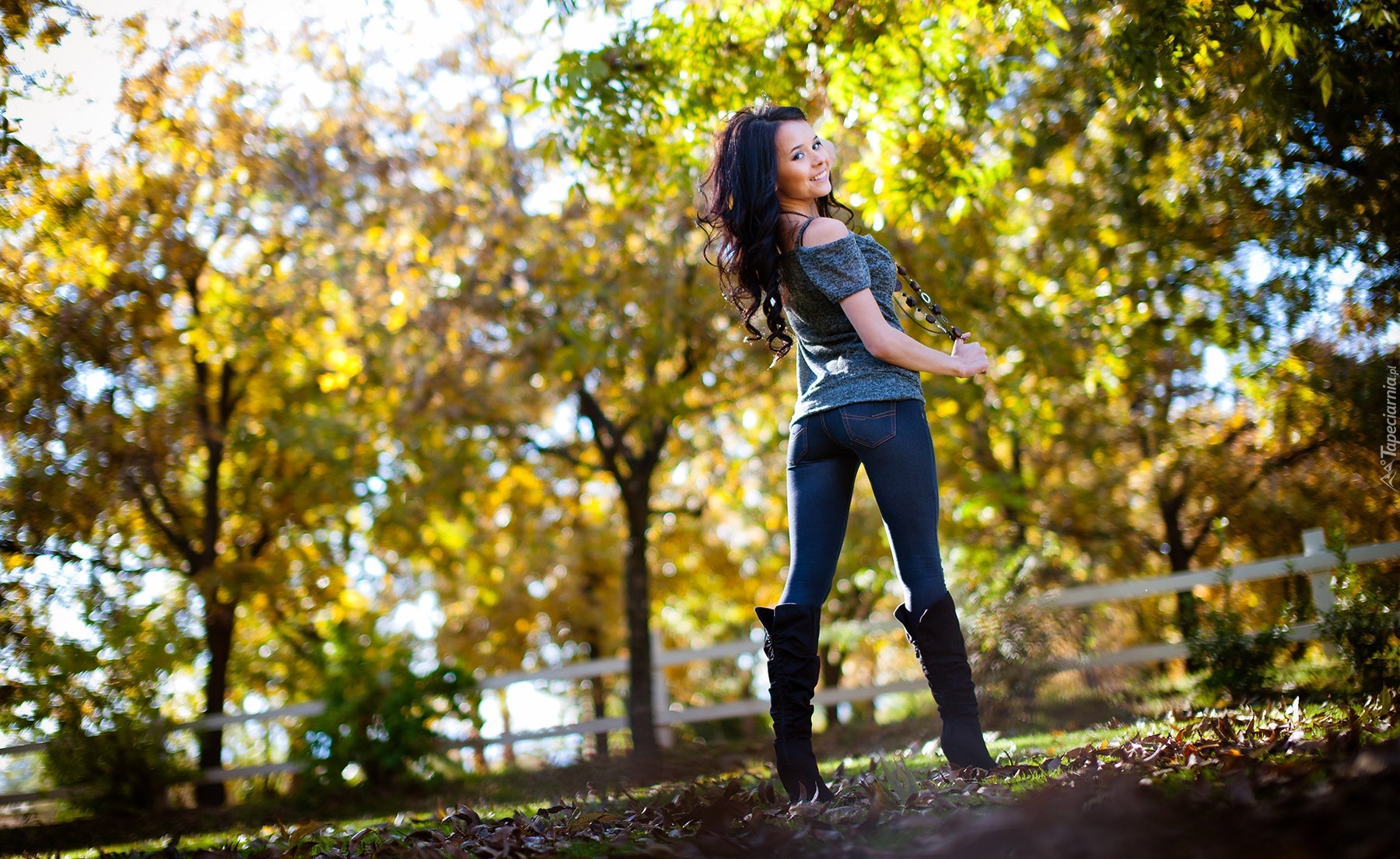Edytor tapety: Brunetka, Korale, Kozaki, Uśmiech