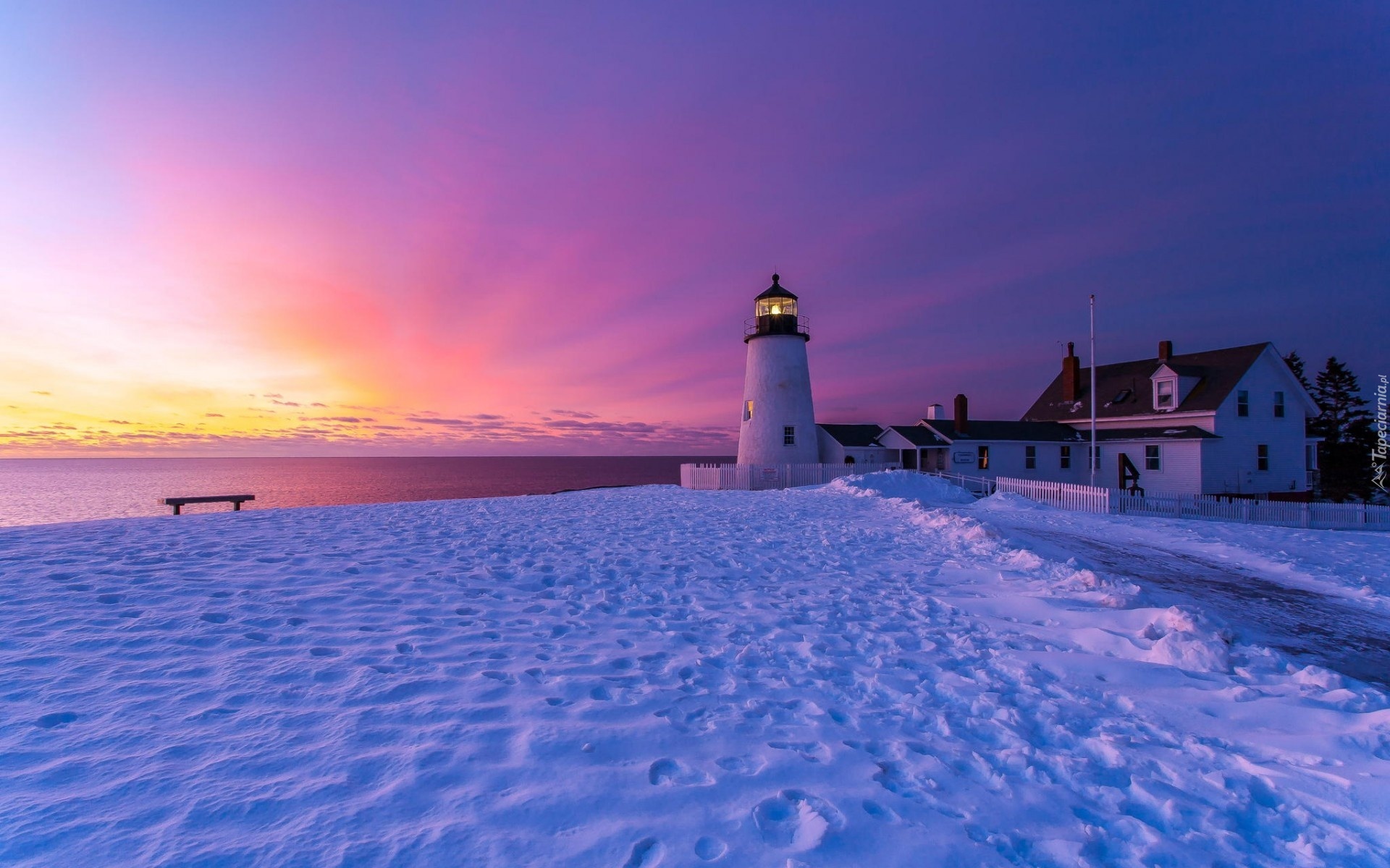 Edytor tapety: Latarnia Morska, Ławka, Morze, Wschód Słońca, Zima