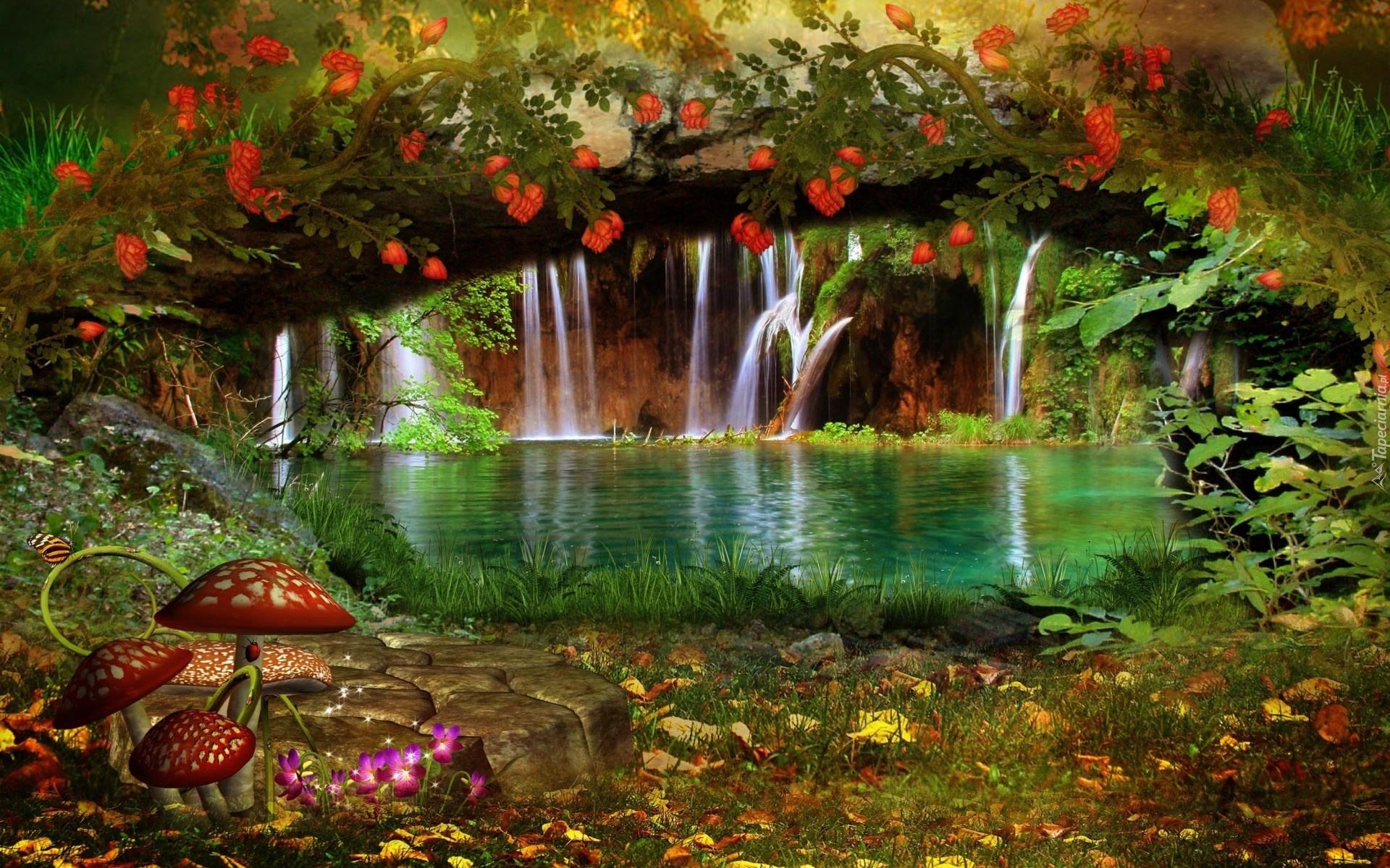Edytor tapety: Las, Wodospad, Zieleń, Kwiaty