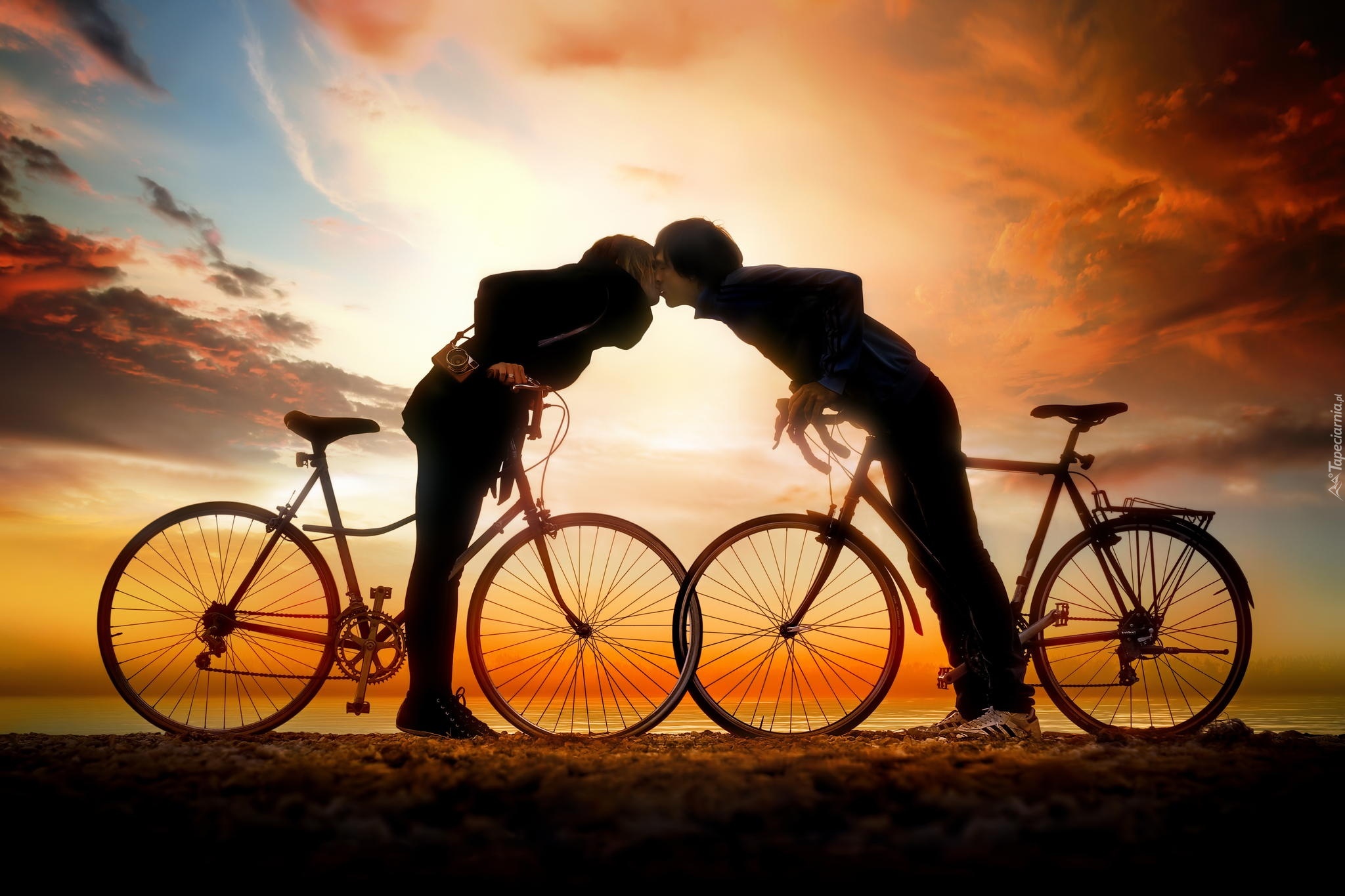 Edytor tapety: Para, Rowery, Zachód, Słońca, Pocałunek