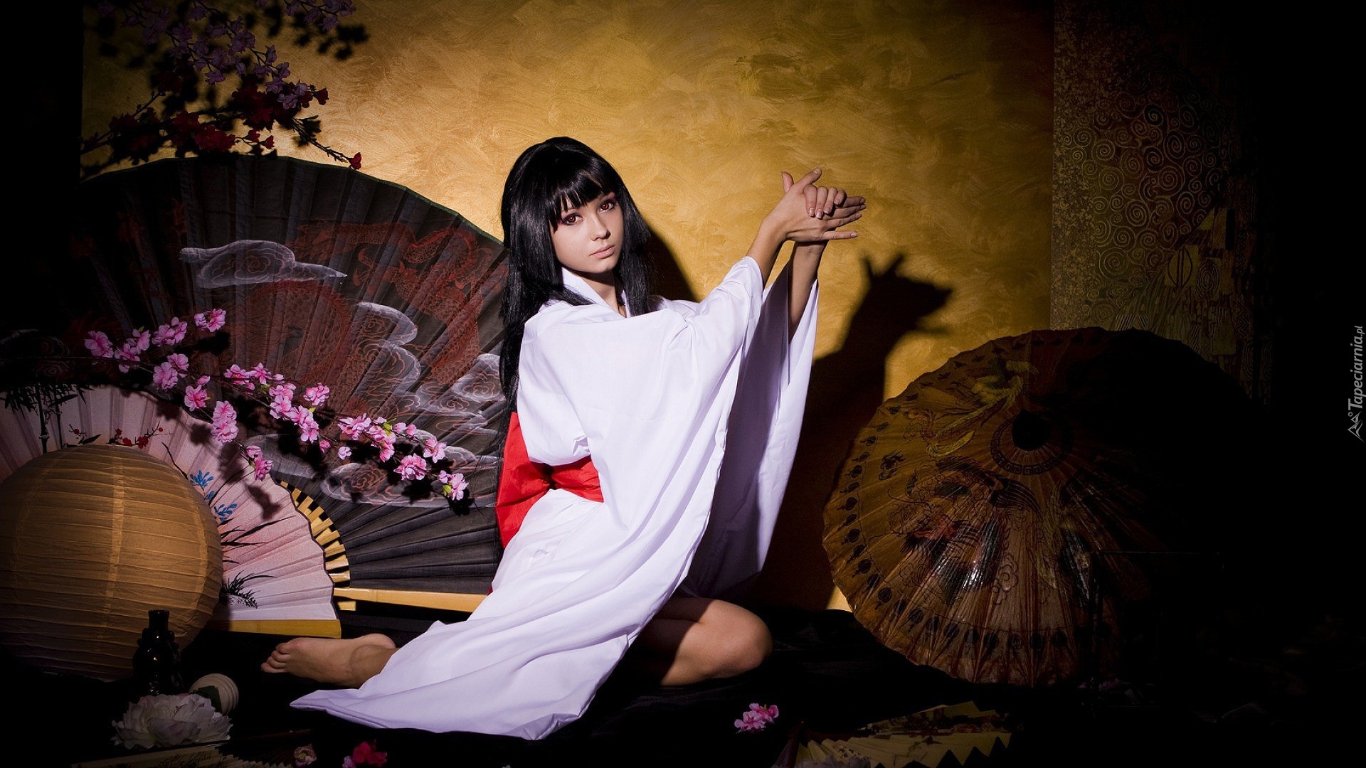 Edytor tapety: Brunetka, Kimono, Wachlarz, Parasolka