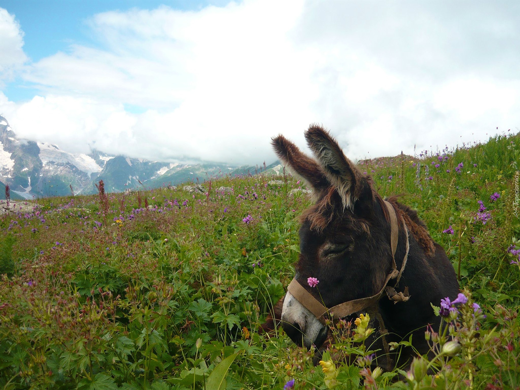 Edytor tapety: Osioł, Osiołek, Góry, Łąka
