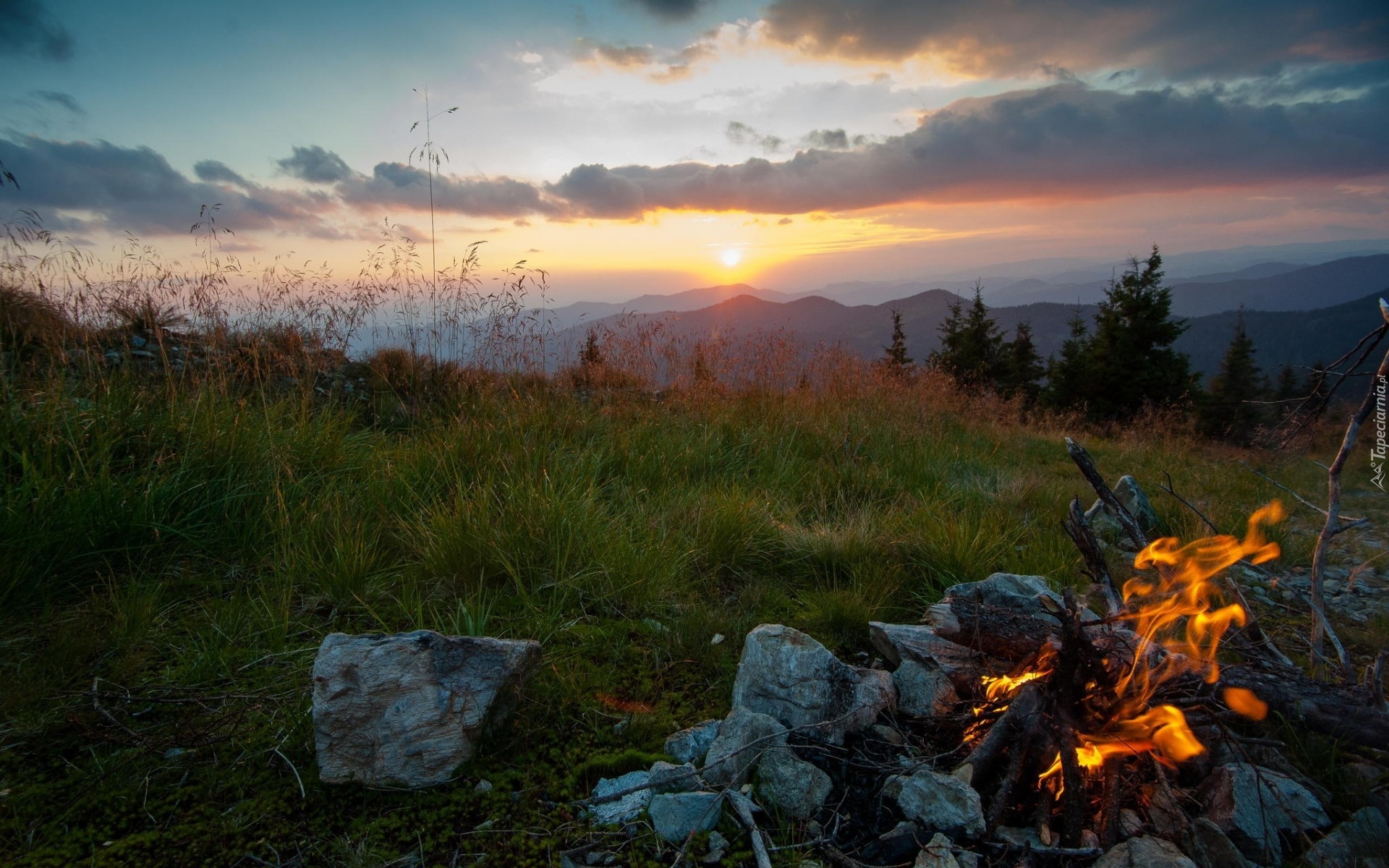 Edytor tapety: Ognisko, Góry, Lasy, Zachód, Słońca