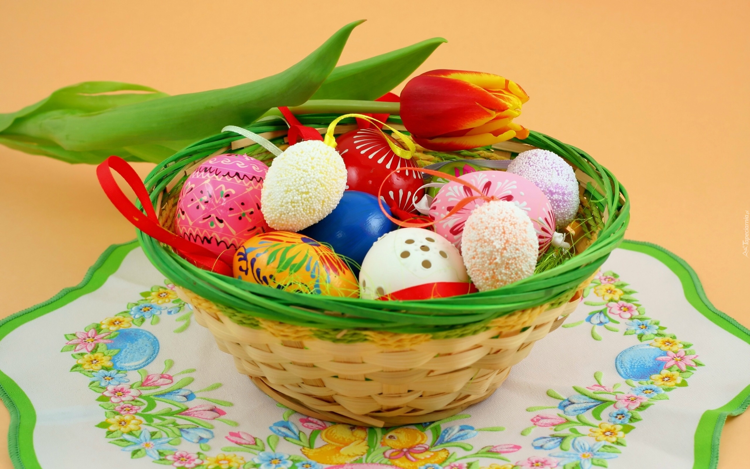 Edytor tapety: Kolorowe, Pisanki, Tulipan, Koszyk, Serweta, Wielkanoc