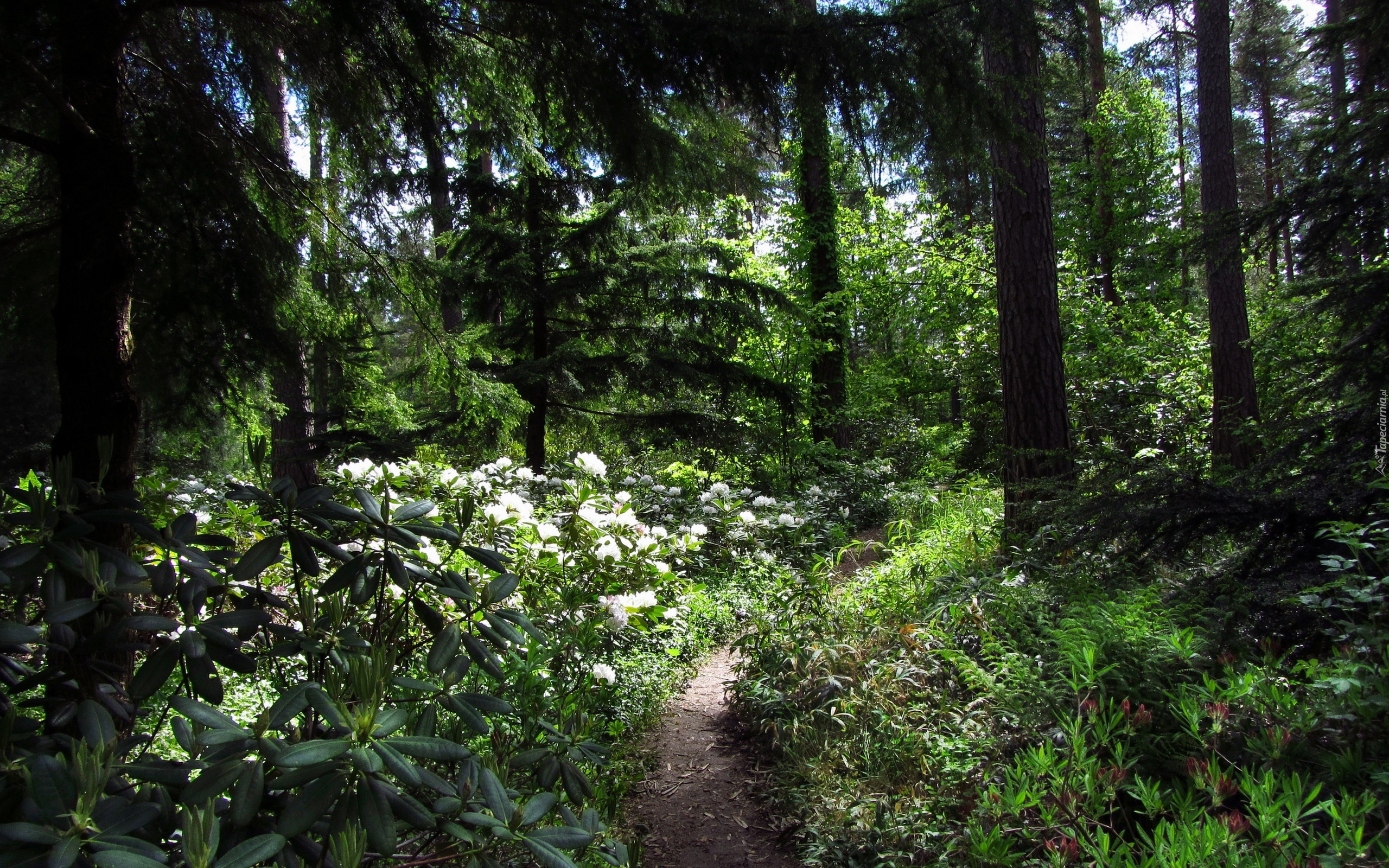Edytor tapety: Las, Ścieżka, Kwiaty, Przebijające, Światło, Wiosna