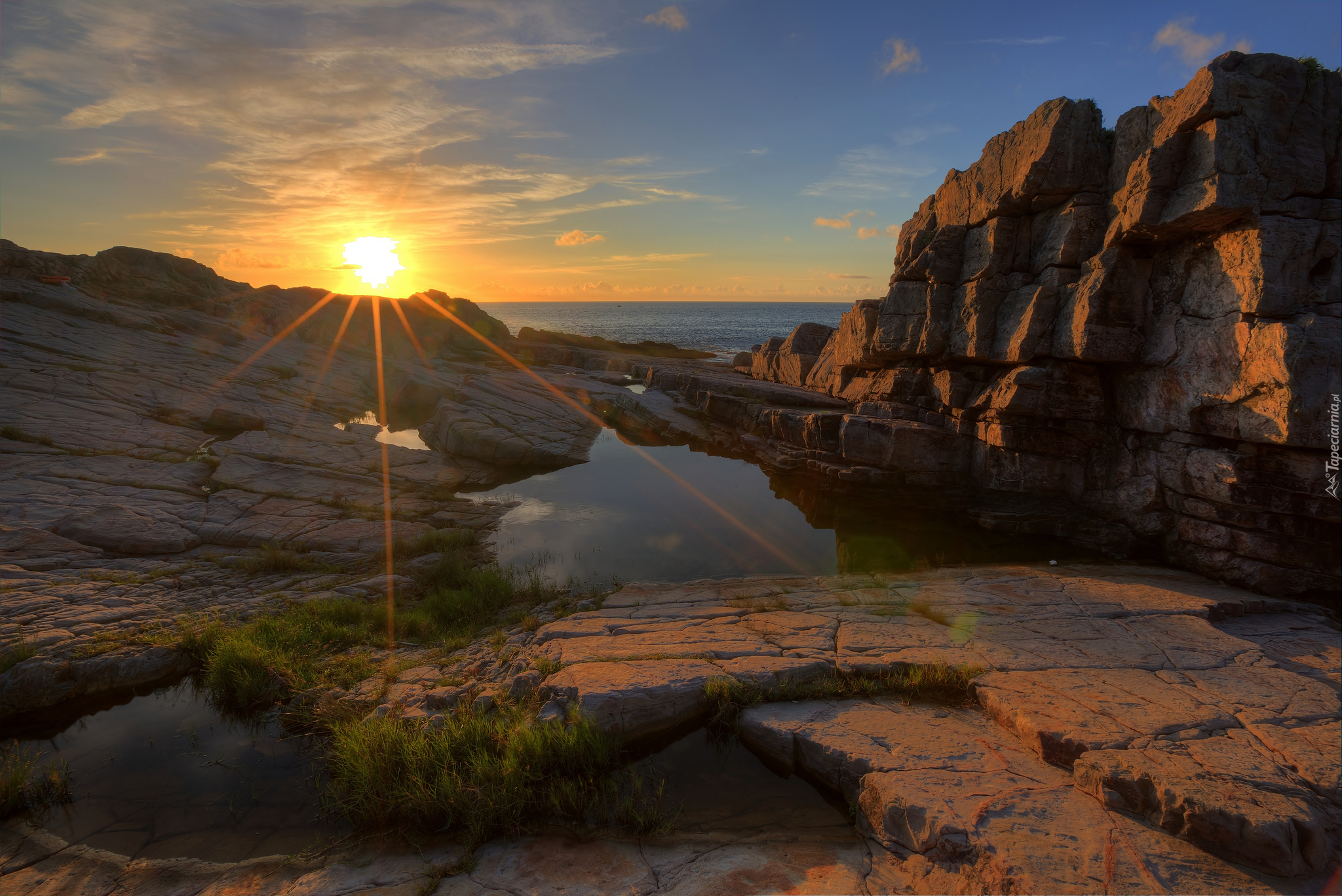 Edytor tapety: Morze, Wybrzeże, Skały, Promienie, Słońca