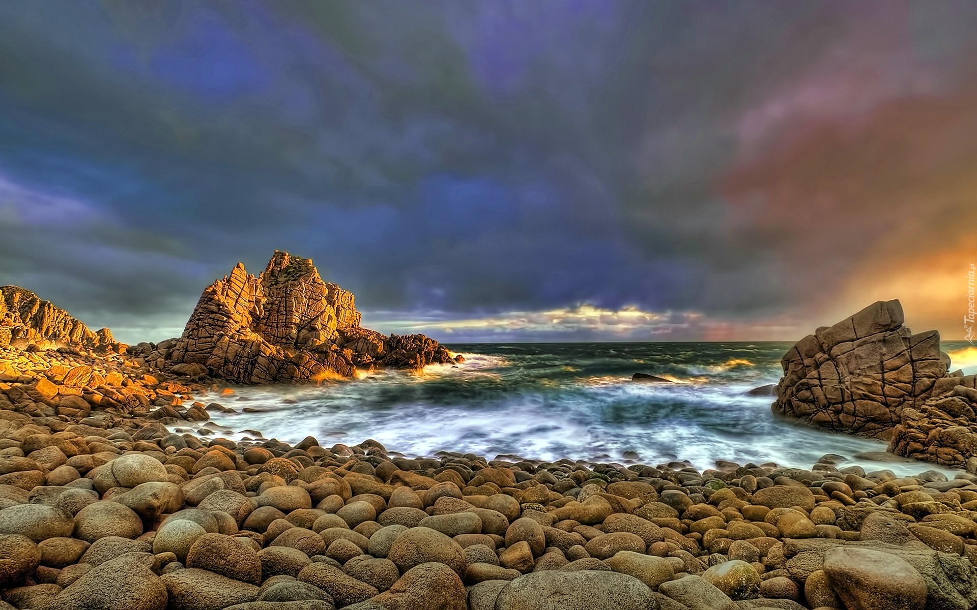 Edytor tapety: Morze, Wybrzeże, Skały, Kamienie, Przebijające, Światło