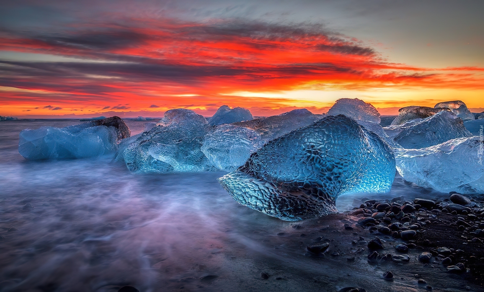 Edytor tapety: Zachód, Słońca, Bryły, Lodu, Kamienie
