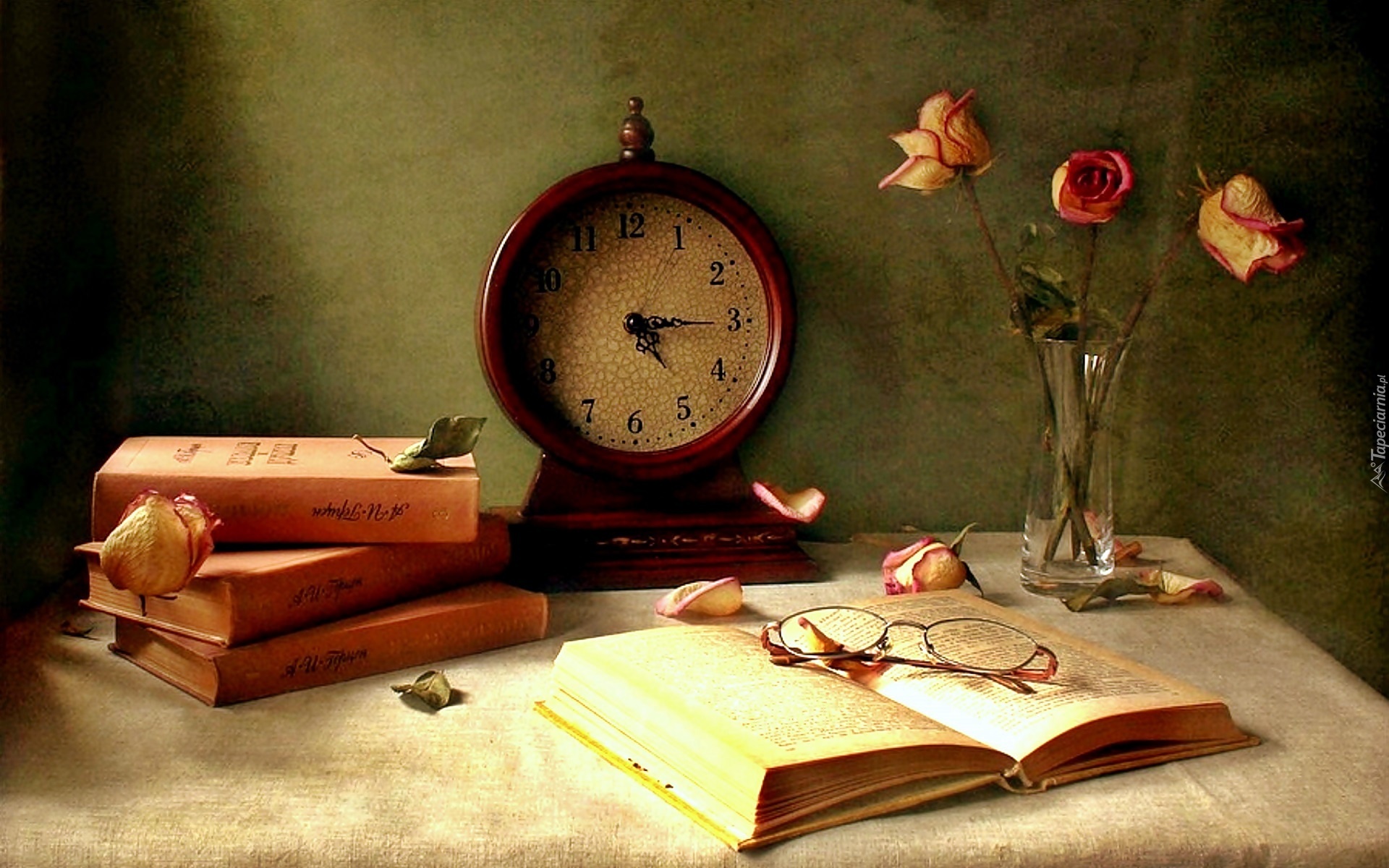 Edytor tapety: Zegar, Róże, Książki, Okulary