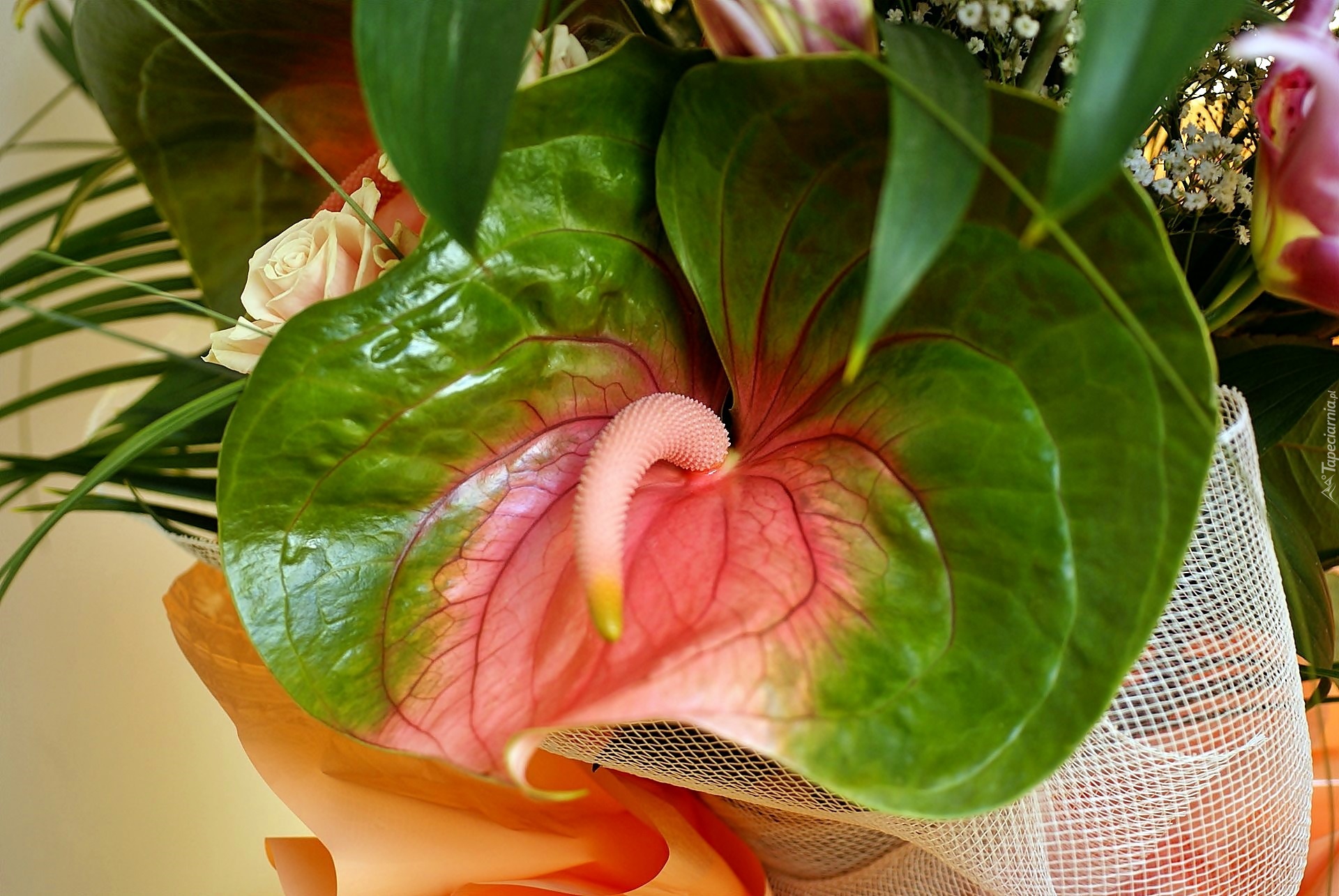 Edytor tapety: Anturium, Róża, Gipsówka, Wiązanka