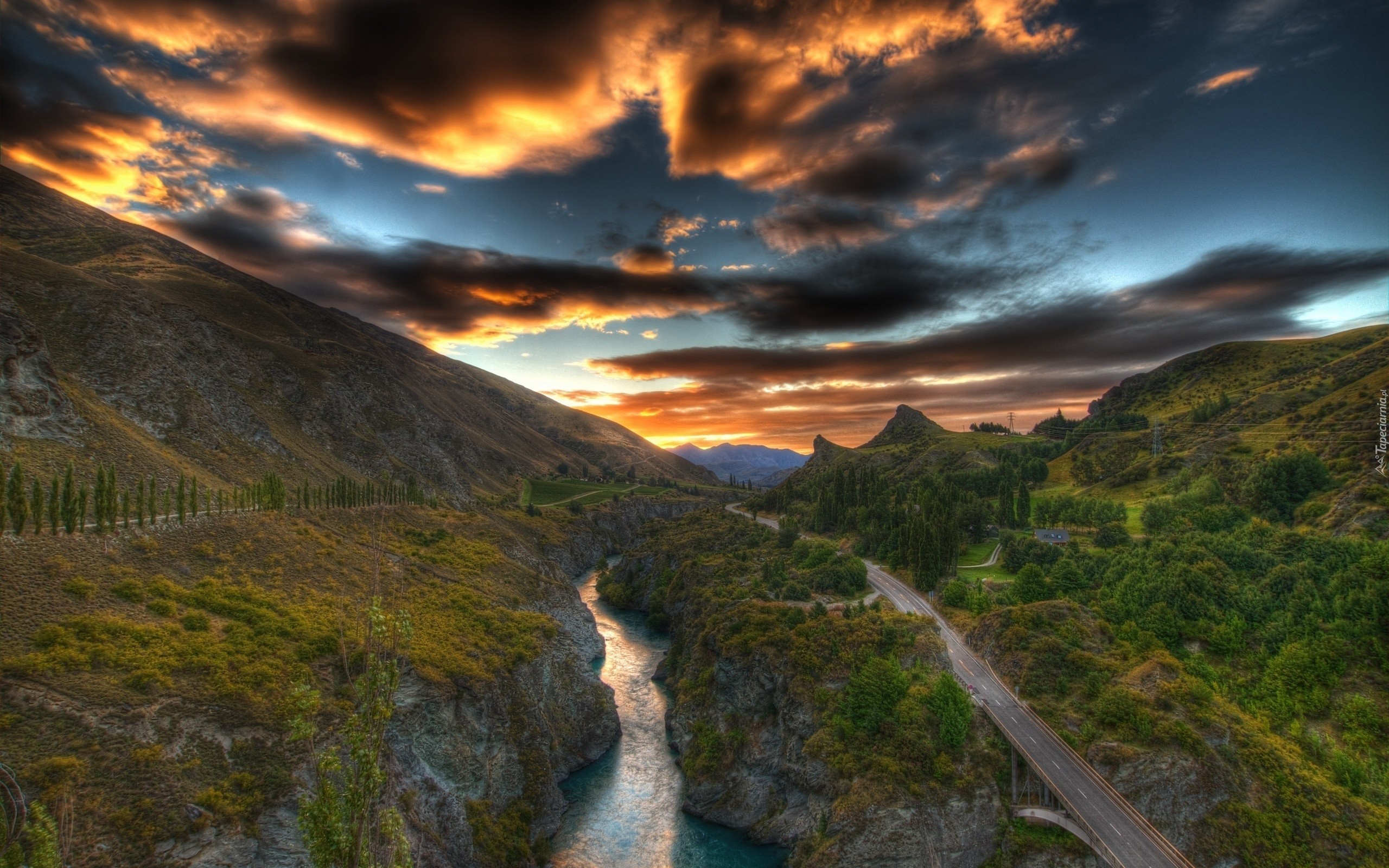Edytor tapety: Góry, Rzeka, Droga, Niebo, Chmury