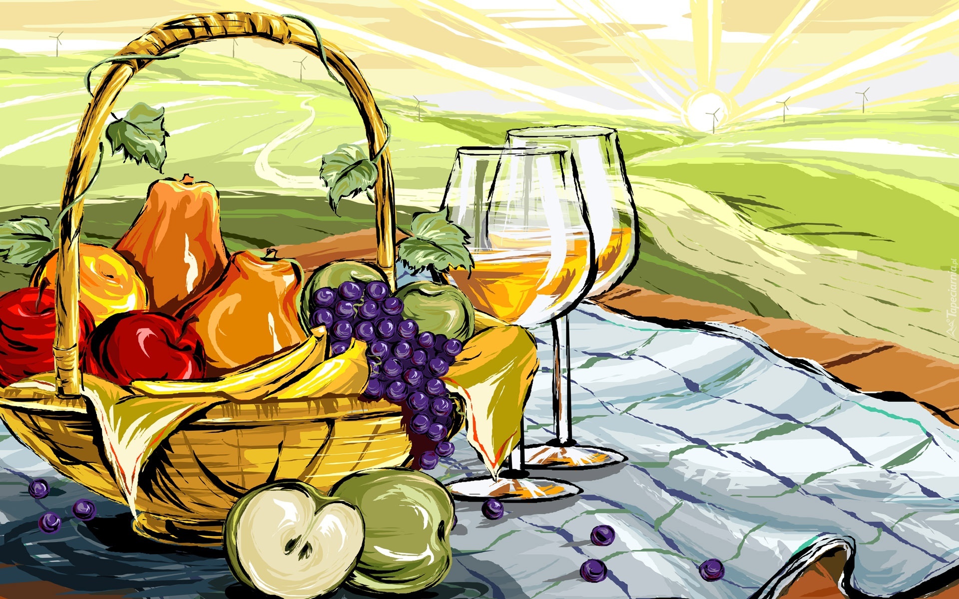 Edytor tapety: Kieliszki, Wino, Koszyk, Owoce, Jabłka, Gruszki, Winogrona, Banany Owoce