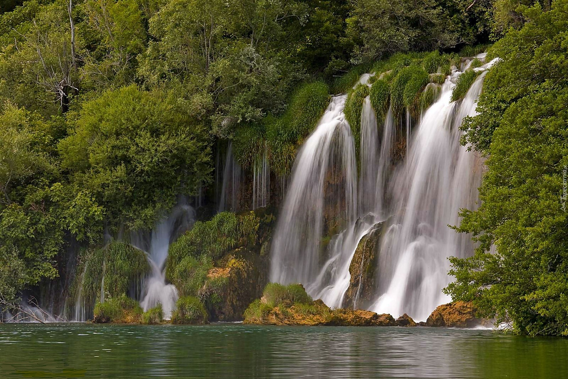 Edytor tapety: Las, Skały, Wodospad, Jezioro