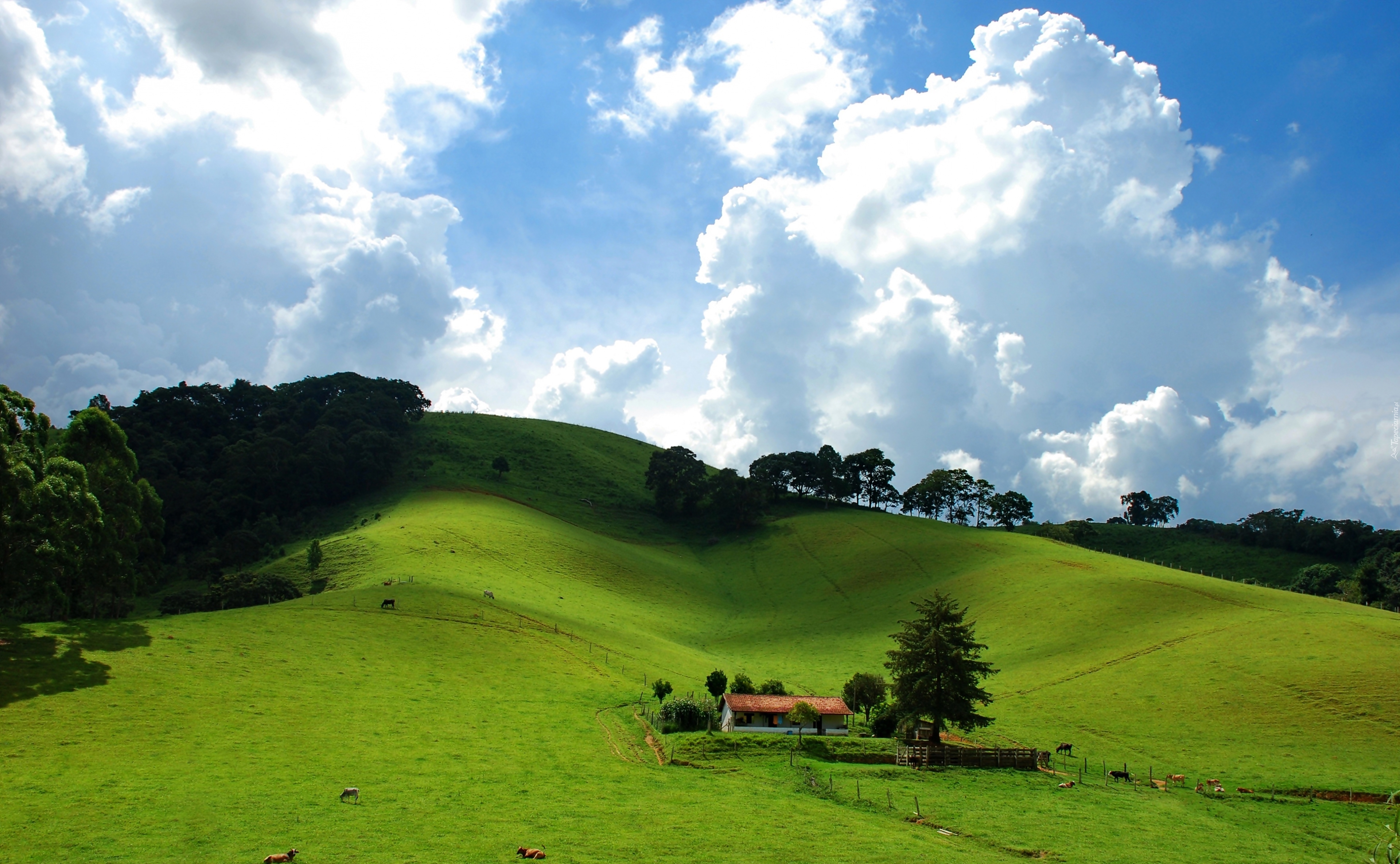 Edytor tapety: Lato, Wieś, Pola, Łąki, Niebo, Chmury, Zabudowania, Krowy