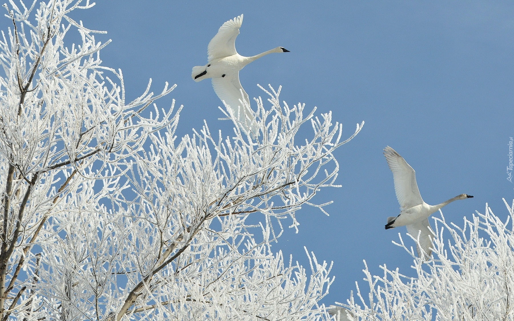 Edytor tapety: Łabędzie, Lot, Oszronione, Gałęzie, Drzewo