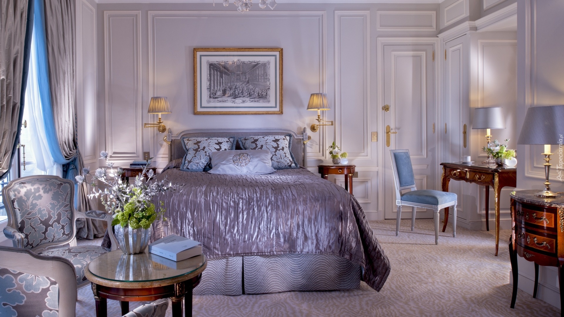 Edytor tapety: Sypialnia, Żyrandol, Lampy, Krzesła, Okrągły, Stół, Książki