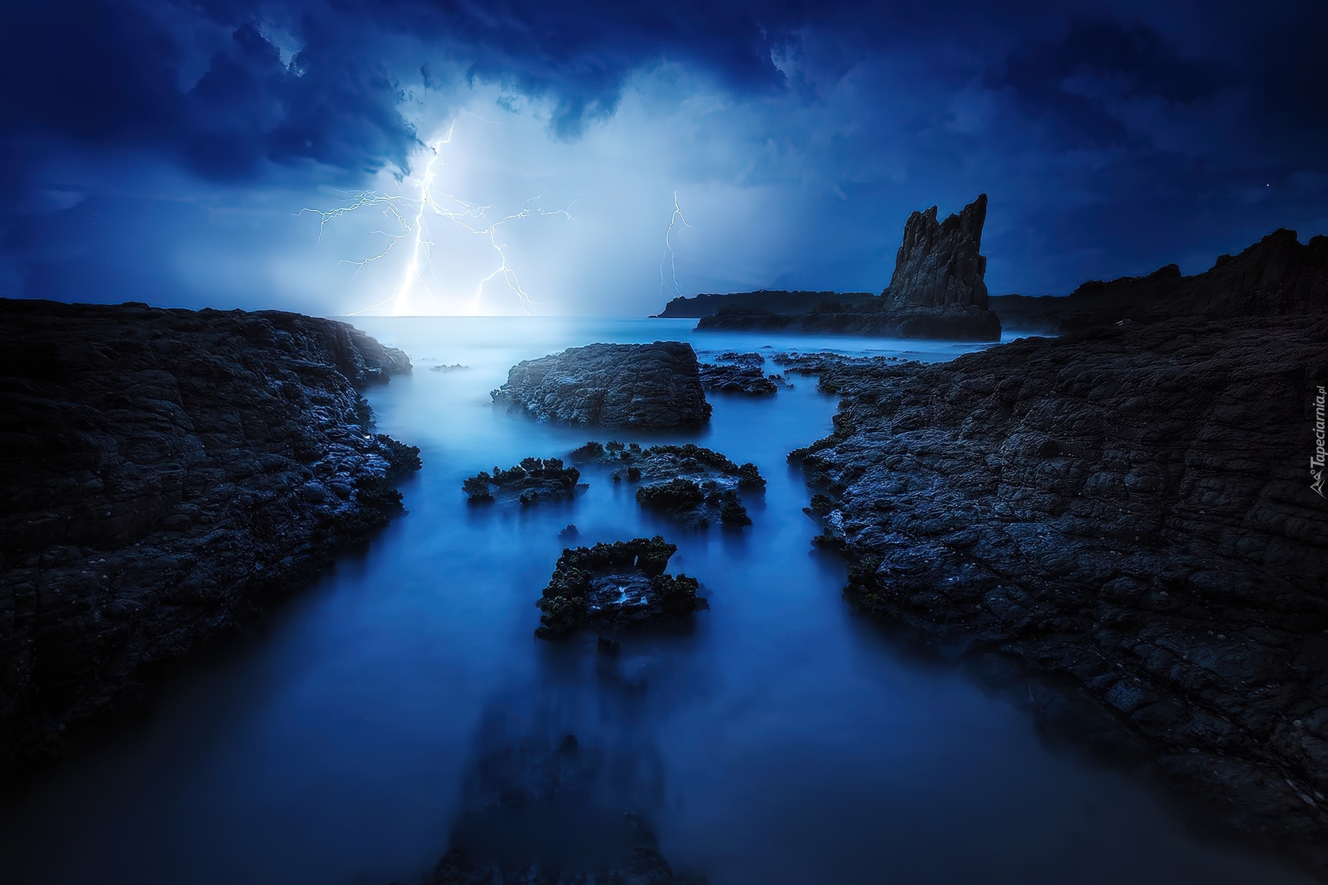 Edytor tapety: Skały, Morze, Błyskawica
