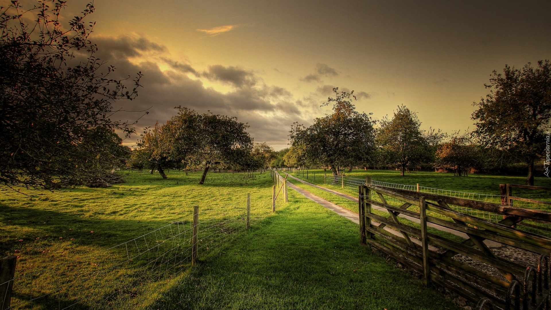 Edytor tapety: Sad, Drzewa, Owocowe, Droga, Ogrodzenie