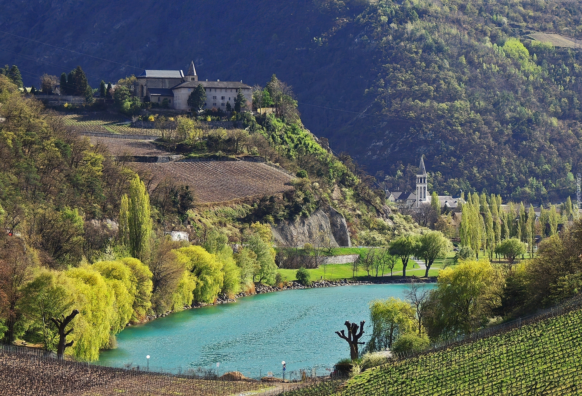 Edytor tapety: Jeziorko, Park, Góry, Pola, Zabudowania