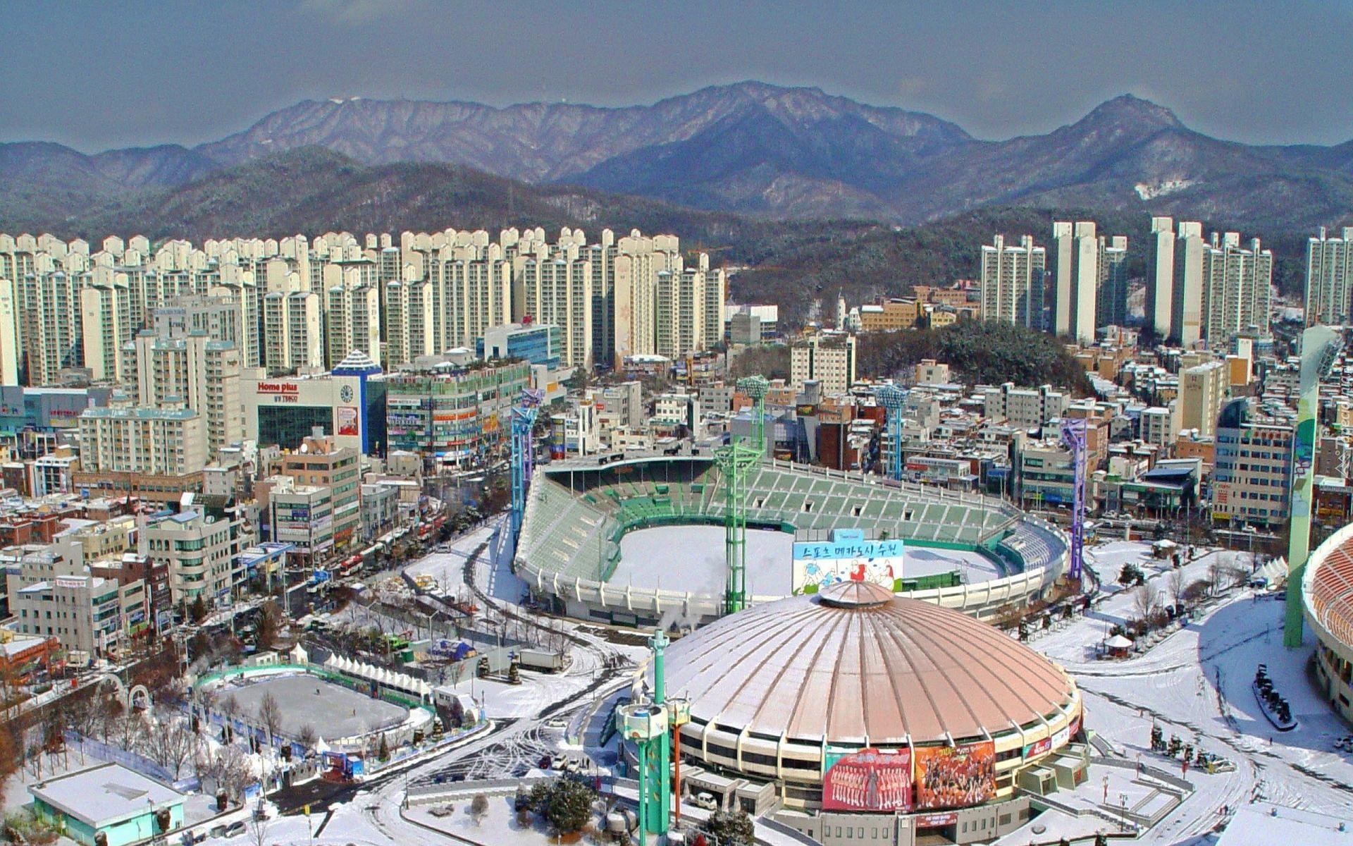 Edytor tapety: Korea Południowa, Suwon, Miasto, Góry, Zima