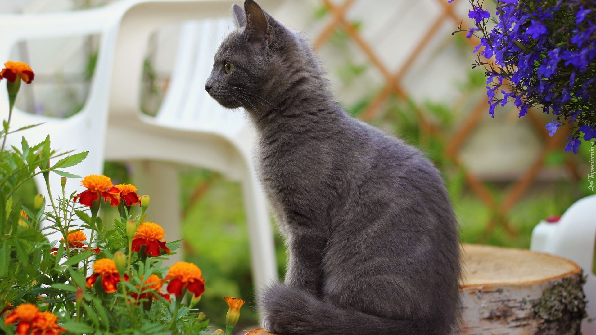 Edytor tapety: Aksamitki, Kot, Pień, Drzewa