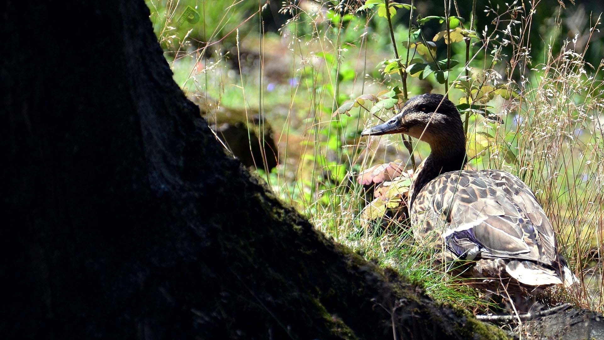Edytor tapety: Kaczka, Trawa, Pień, Drzewa