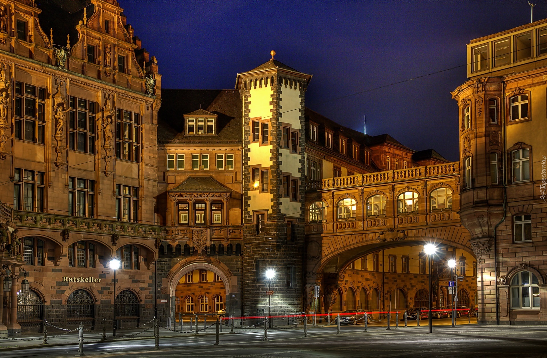 Edytor tapety: Miasteczko, Nocą, Uliczka, Domy, Ratusz, Restauracja
