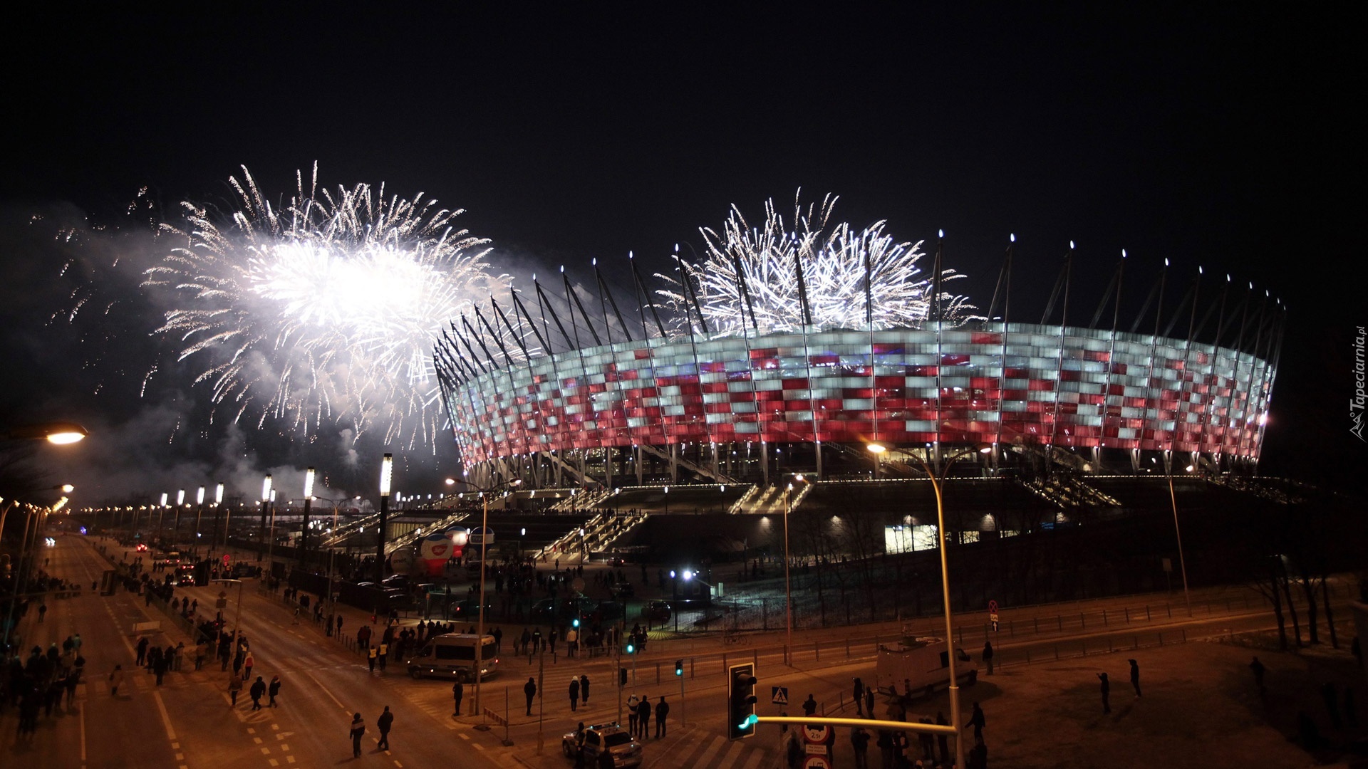 Edytor tapety: Polska, Warszawa, Stadion Narodowy, Fajerwerki, Ludzie, Noc
