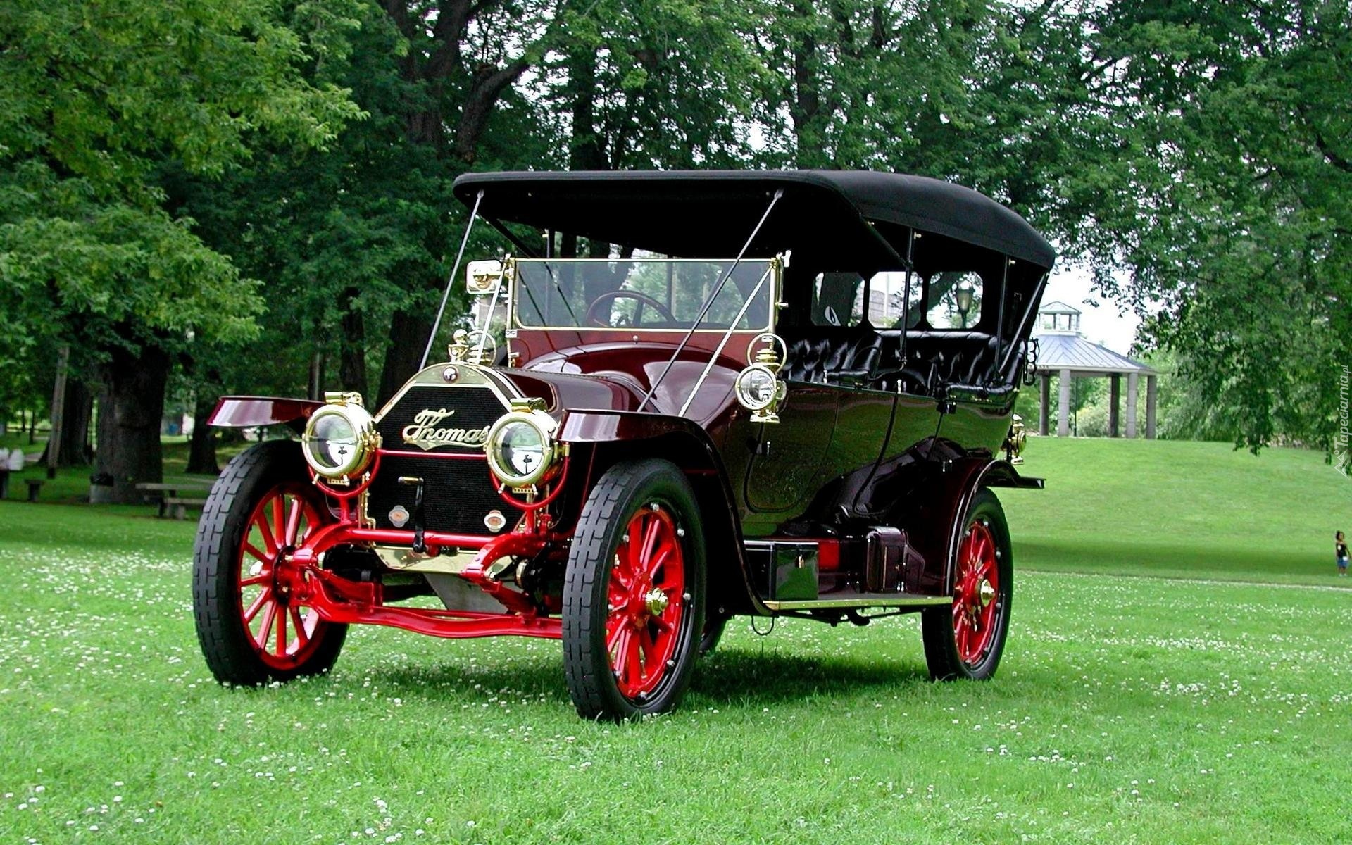 Edytor tapety: Samochód, Zabytkowy, Thomas, Flyer 1912, Trawa, Drzewa
