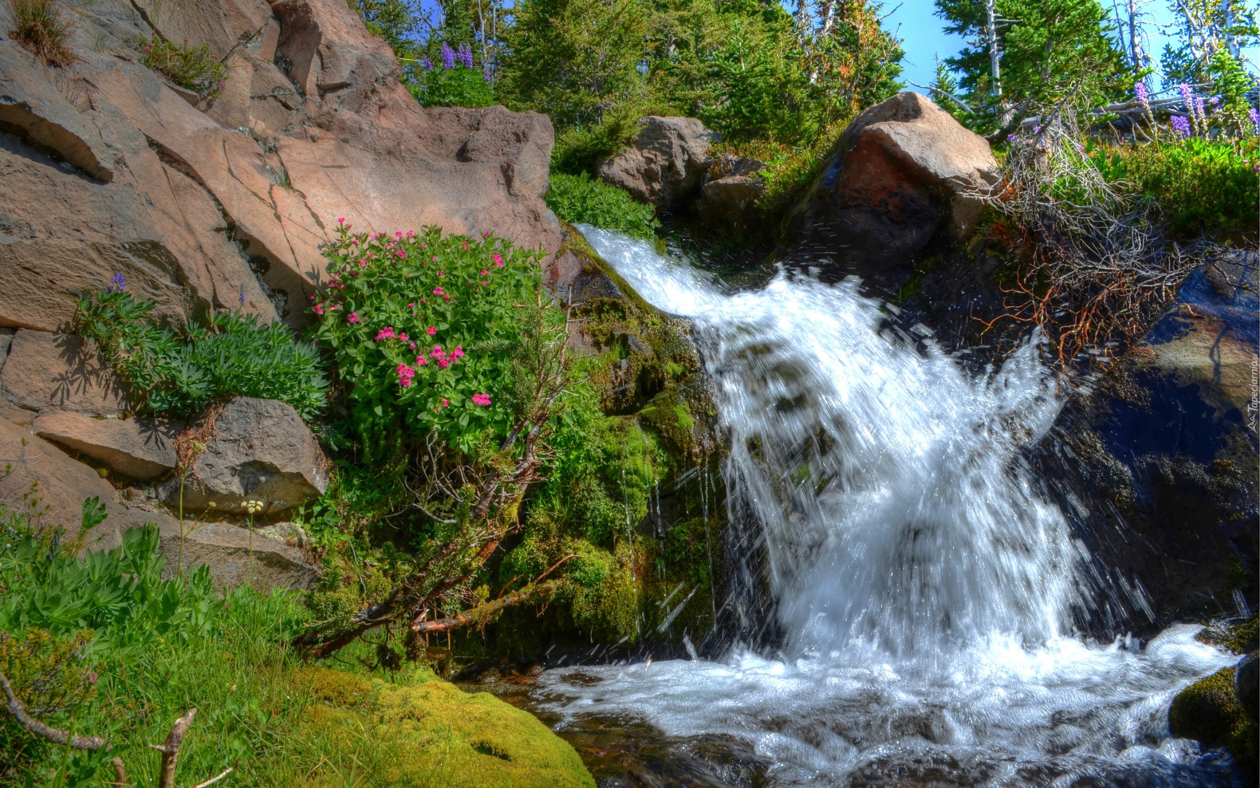 Edytor tapety: Rzeczka, Potok, Kamienie, Skały, Kwiaty
