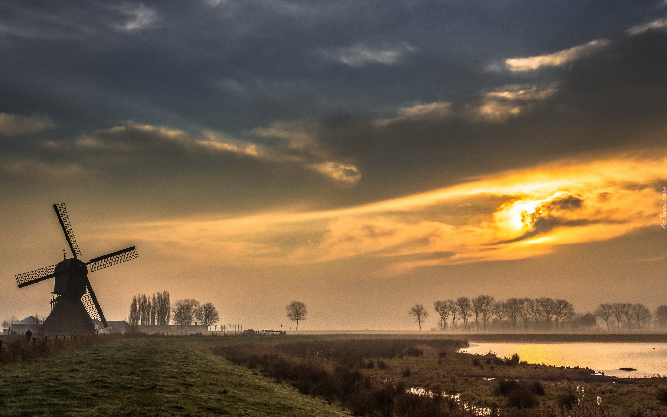 Edytor tapety: Wiatrak, Rzeka, Chmury, Przebijające, Światło, Mgła