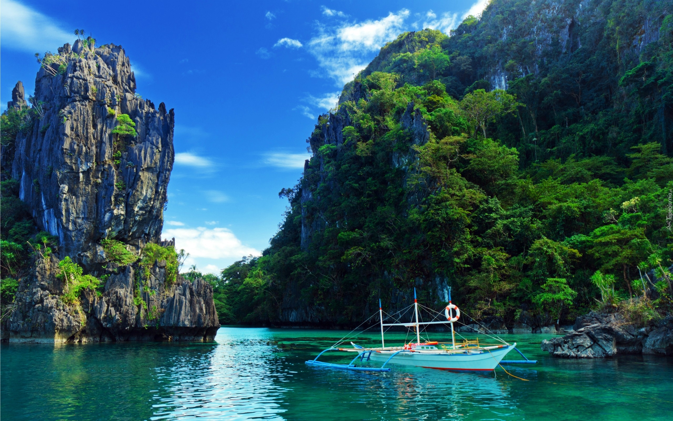 Edytor tapety: Łódz, Jezioro, Skały, Drzewa