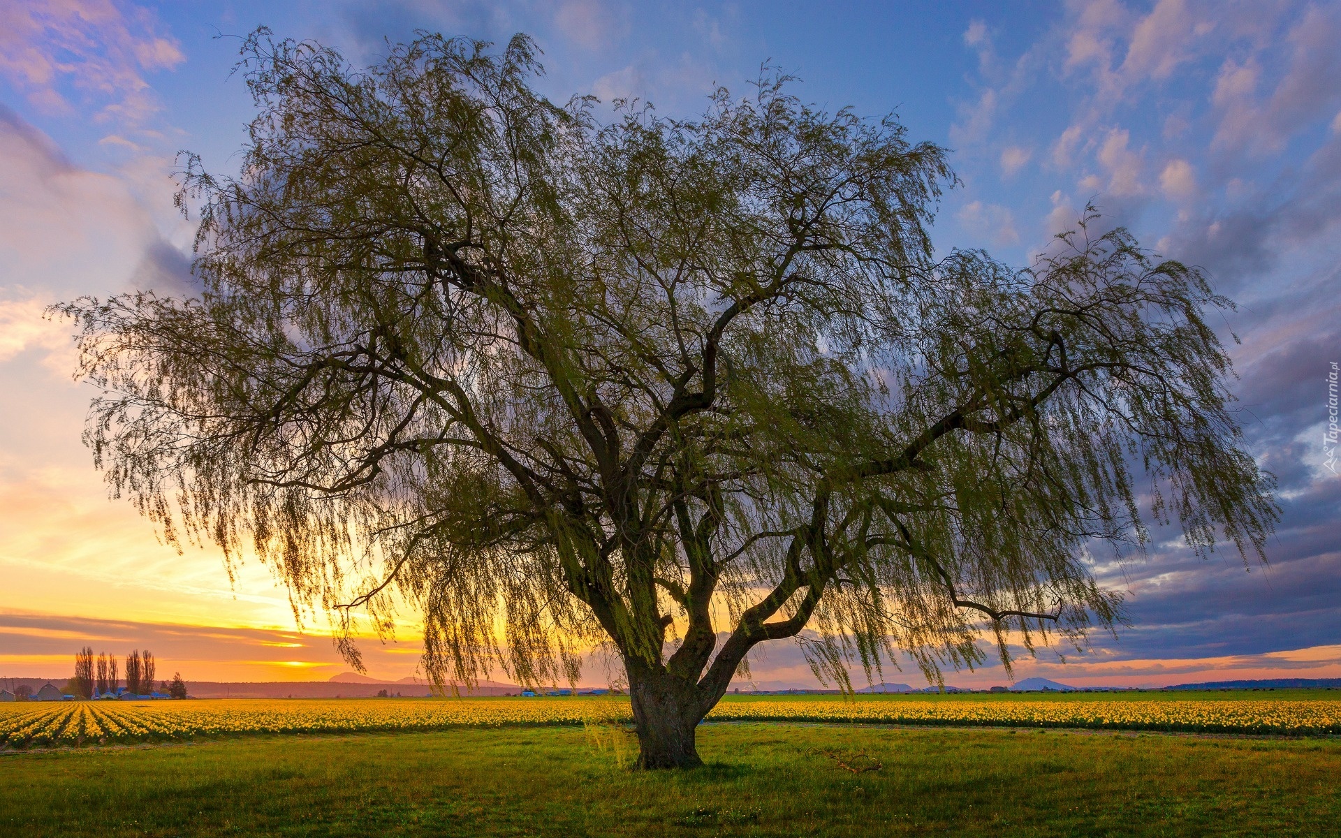 Edytor tapety: Drzewo, Łąka, Pola, Wschód, Słońca, Horyzont, Wiosna