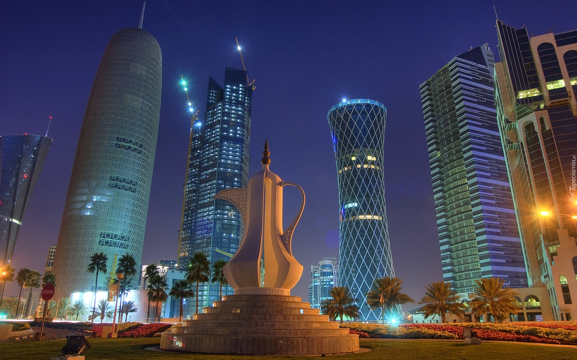 Edytor tapety: Katar, Doha, Drapacze Chmur, Pomnik, Palmy, Noc