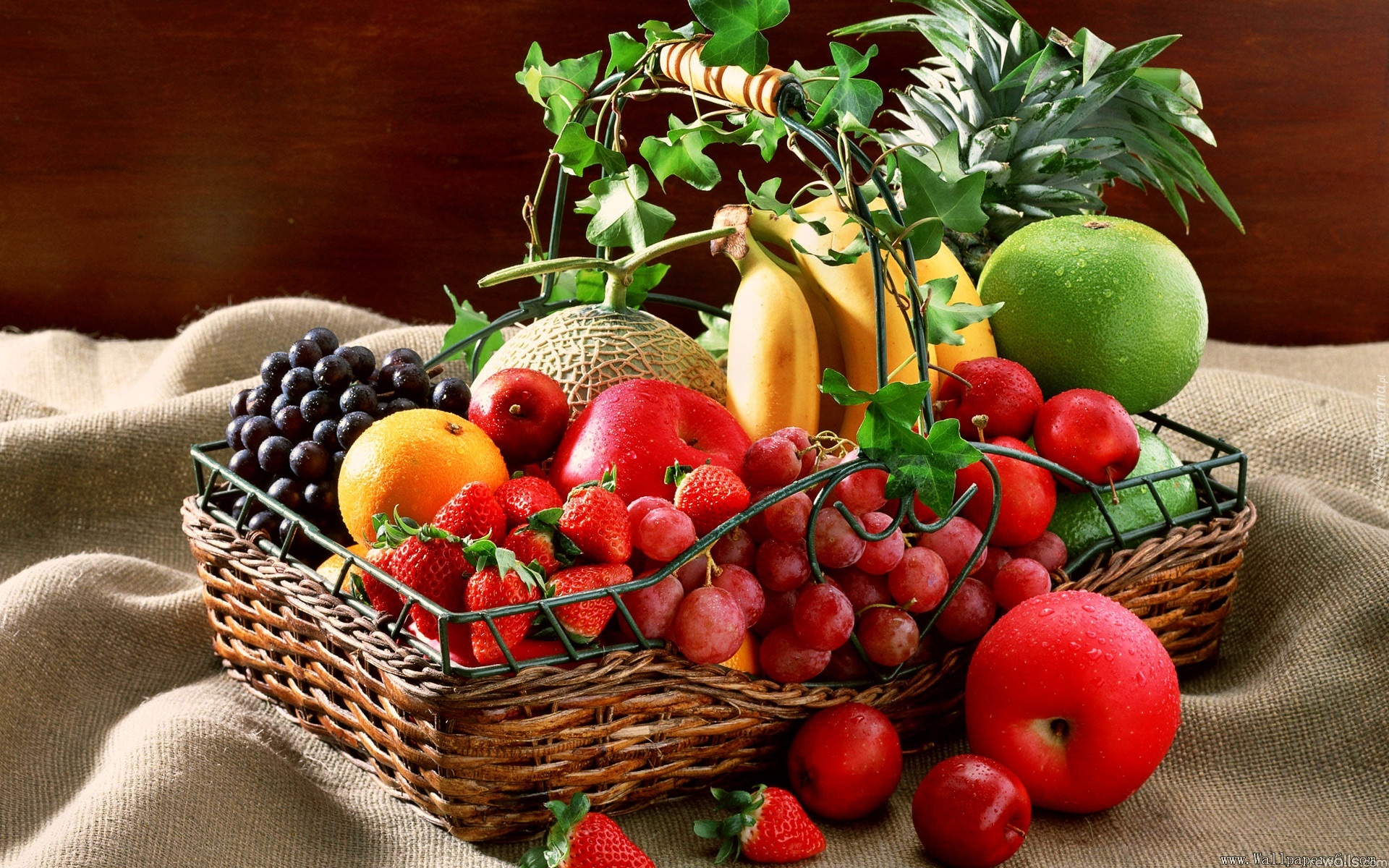 Edytor tapety: Koszyk, Owoców, Jabłka, Banany, Winogrona
