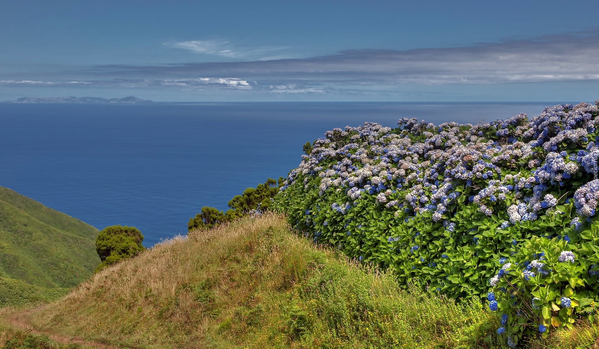 Edytor tapety: Bretania, Morze, Wybrzeże, Kwitnące, Hortensje