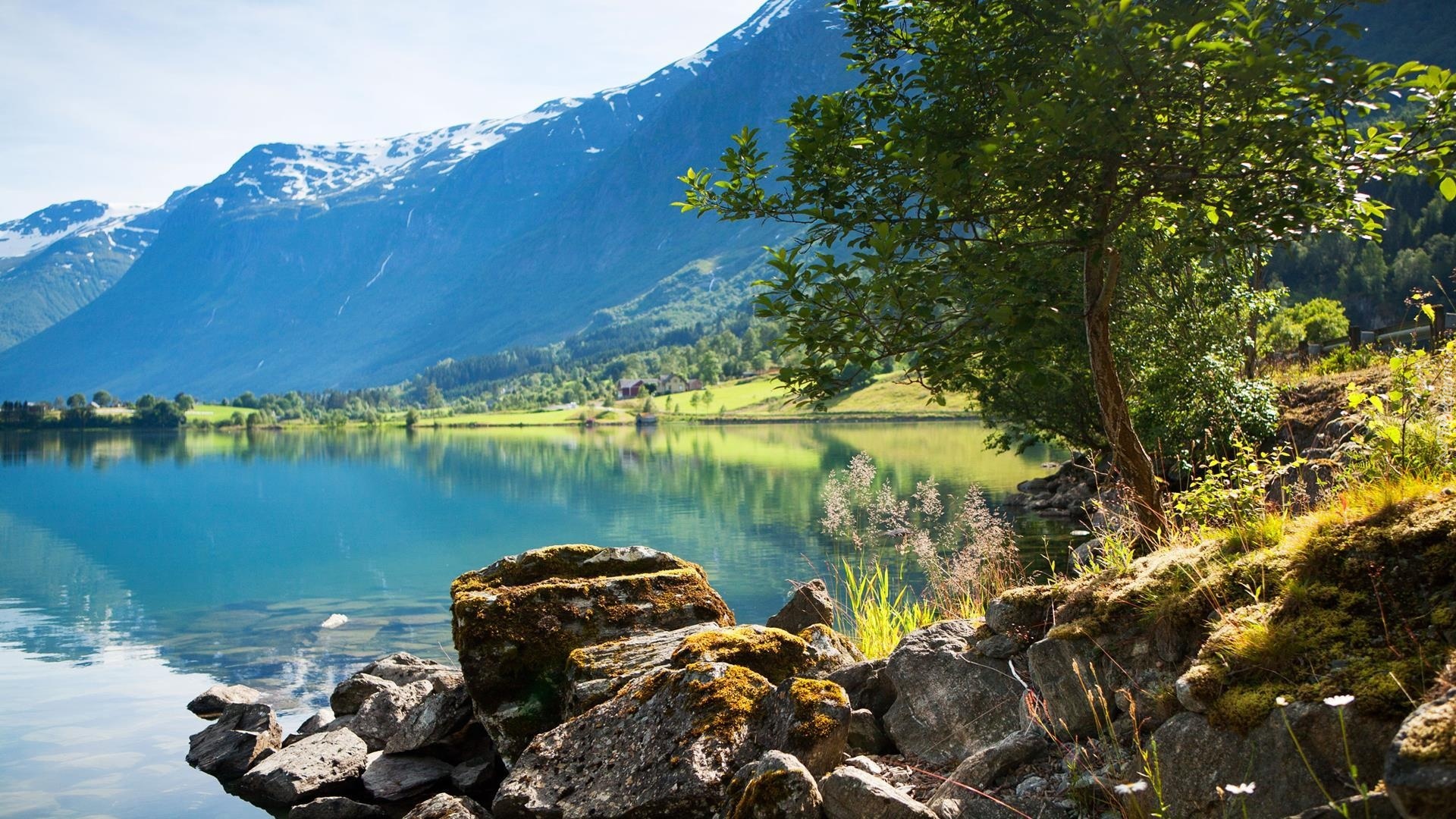 Edytor tapety: Jezioro, Góry, Kamienie, Drzewa