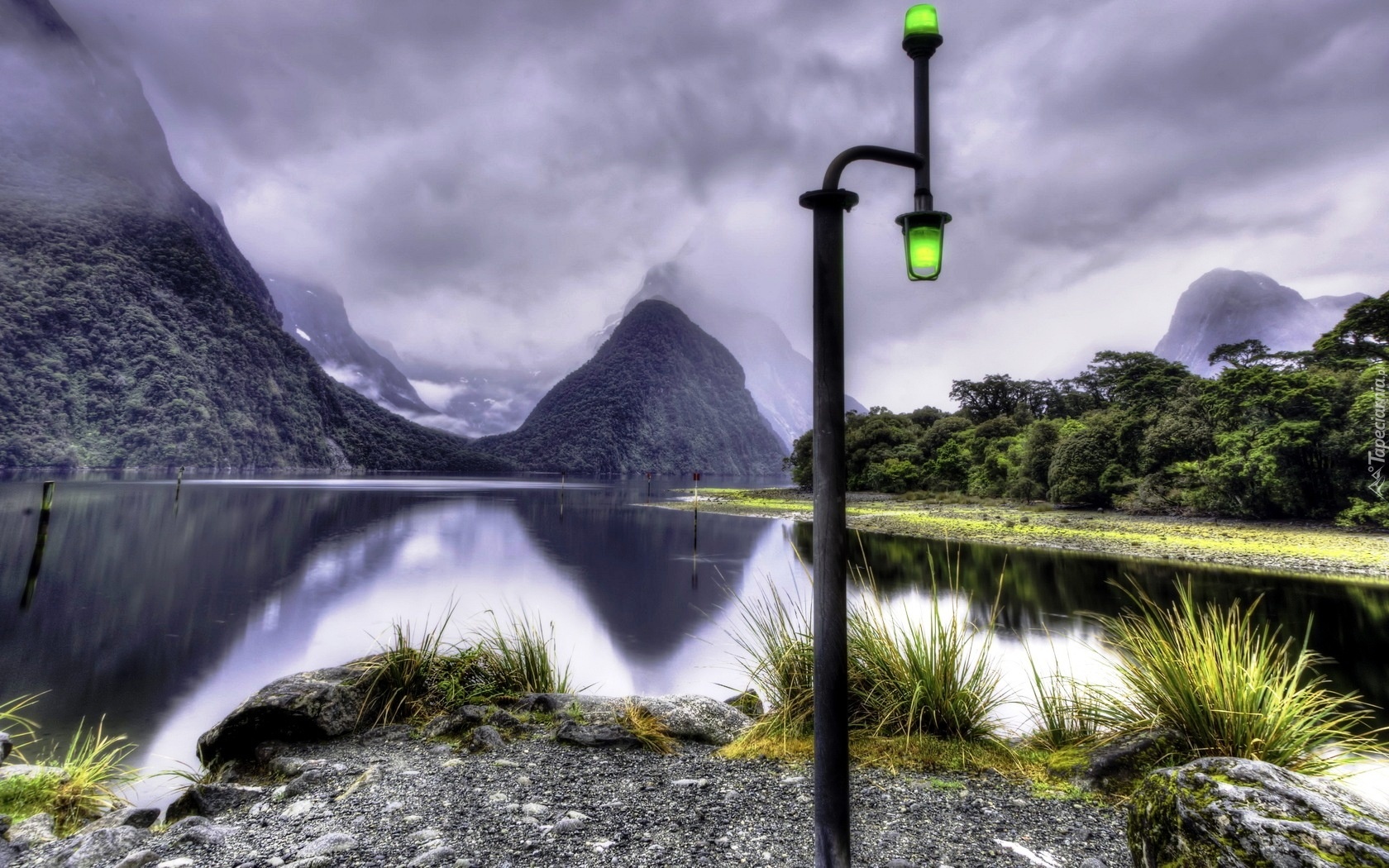 Edytor tapety: Góry, Jezioro, Lampa