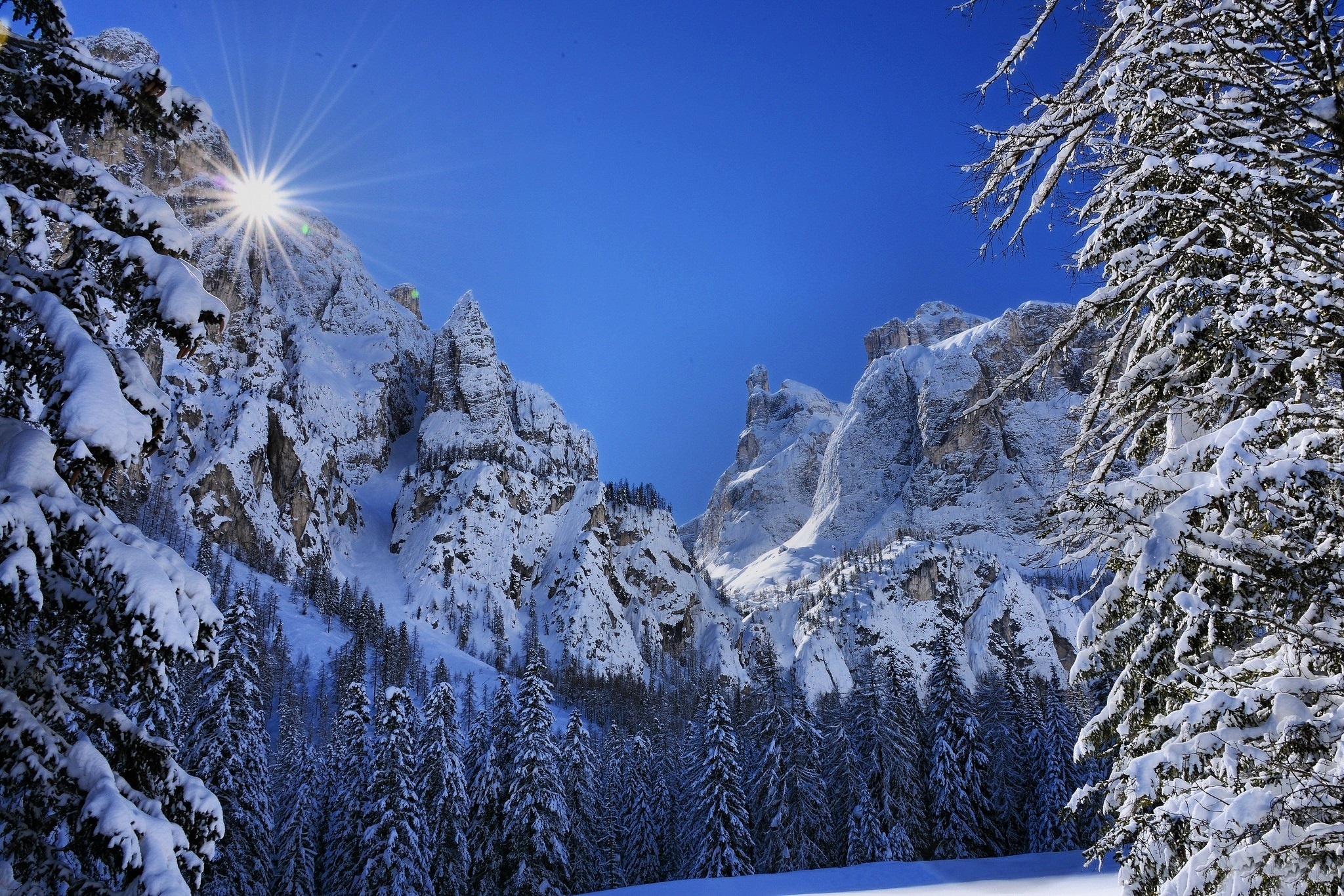Edytor tapety: Zima, Góry, Las, Promienie Słońca
