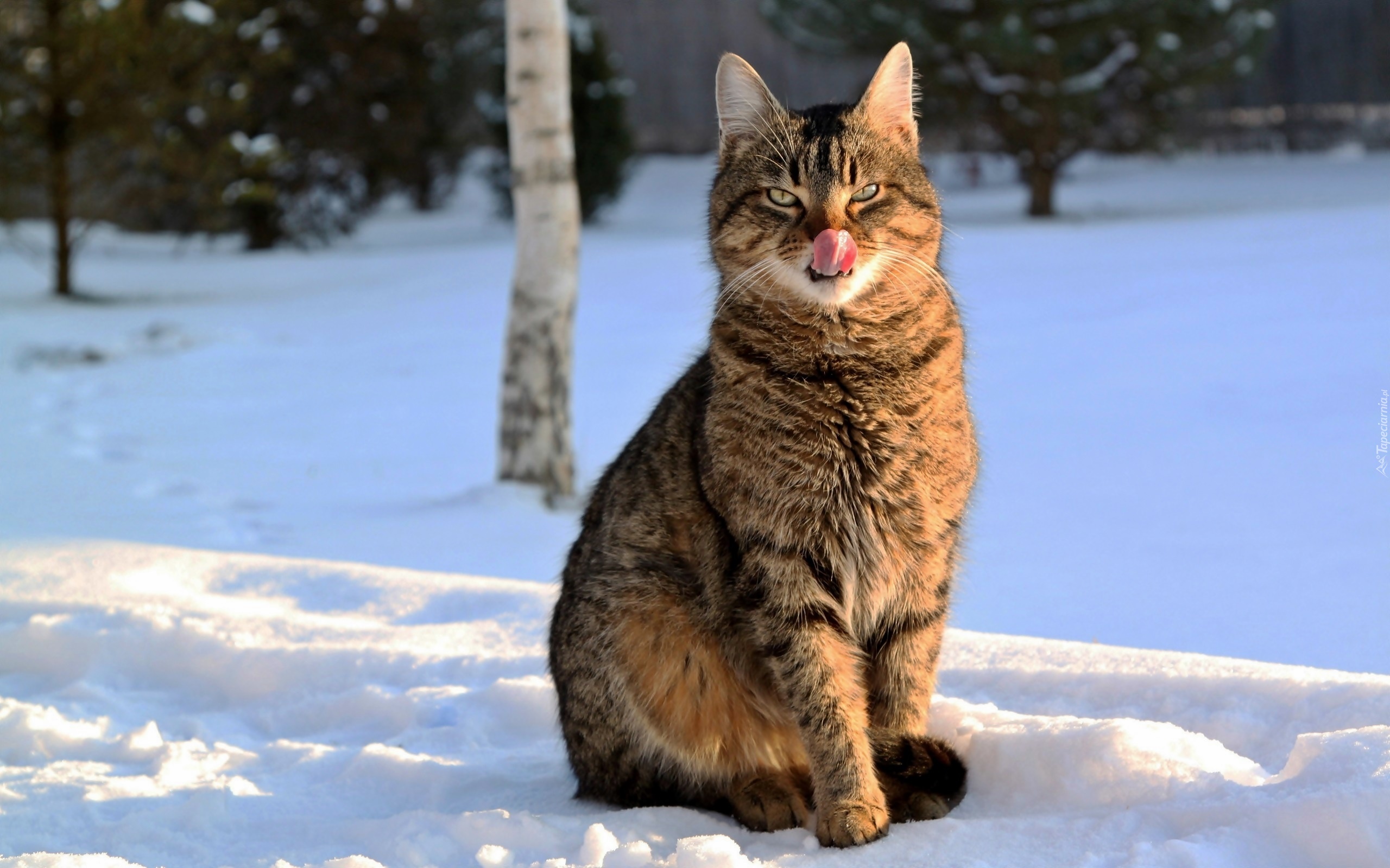 Edytor tapety: Kot, Na Śniegu, Przebijające, Światło, Drzewa, Rozmycie