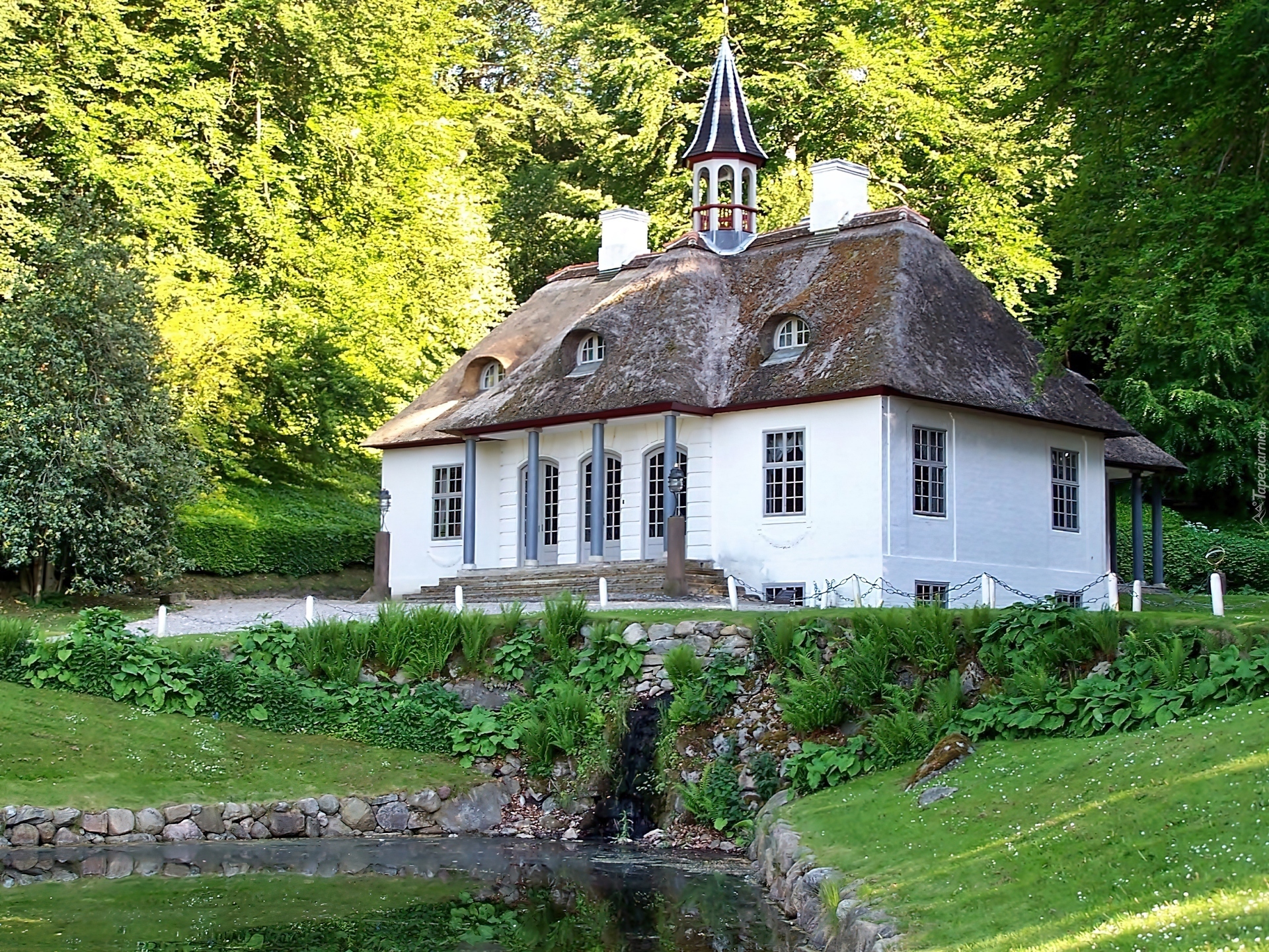 Edytor tapety: Dom, Ogród, Staw, Przebijające, Światło