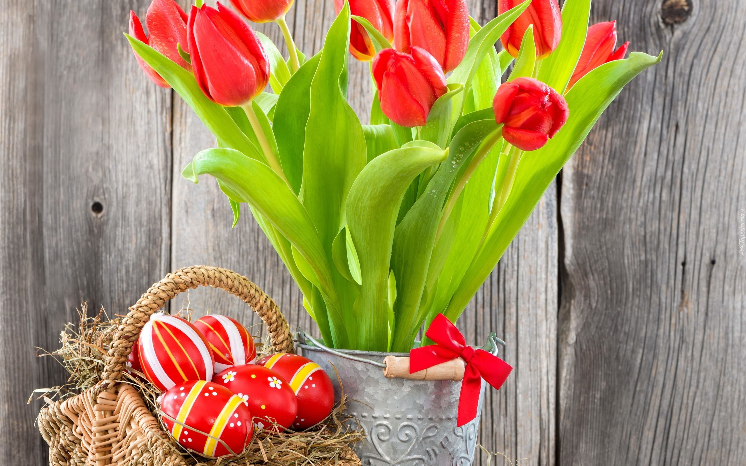 Edytor tapety: Koszyk, Pisanki, Tulipany, Kokarda, Wiadro