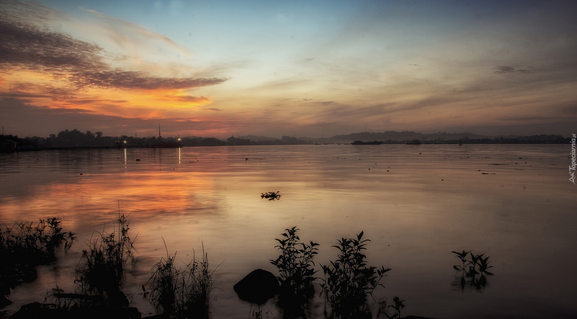 Edytor tapety: Jezioro, Zachód, Słońca, Miasto