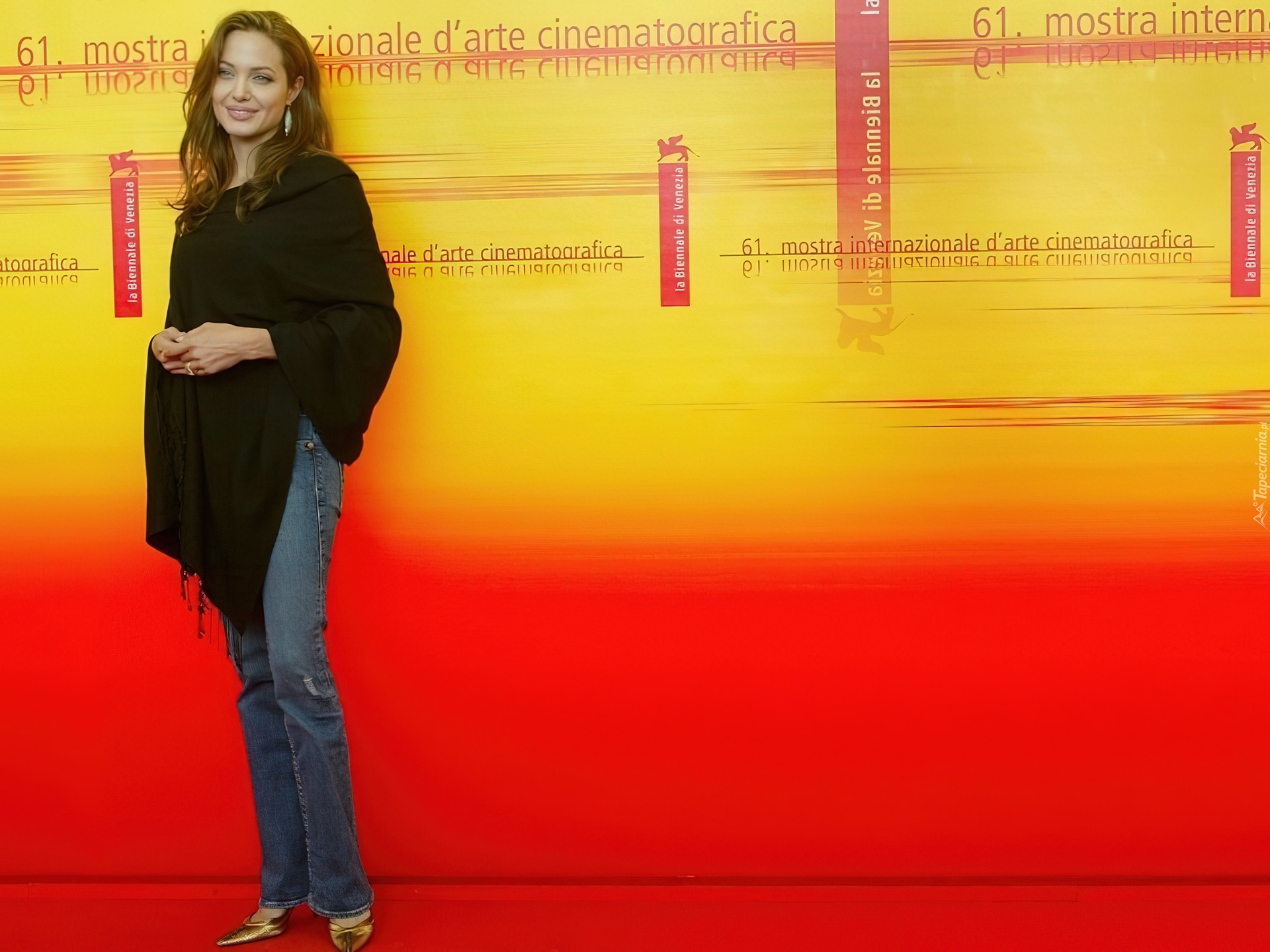 Edytor tapety: Angelina Jolie, jeansy, złote buty